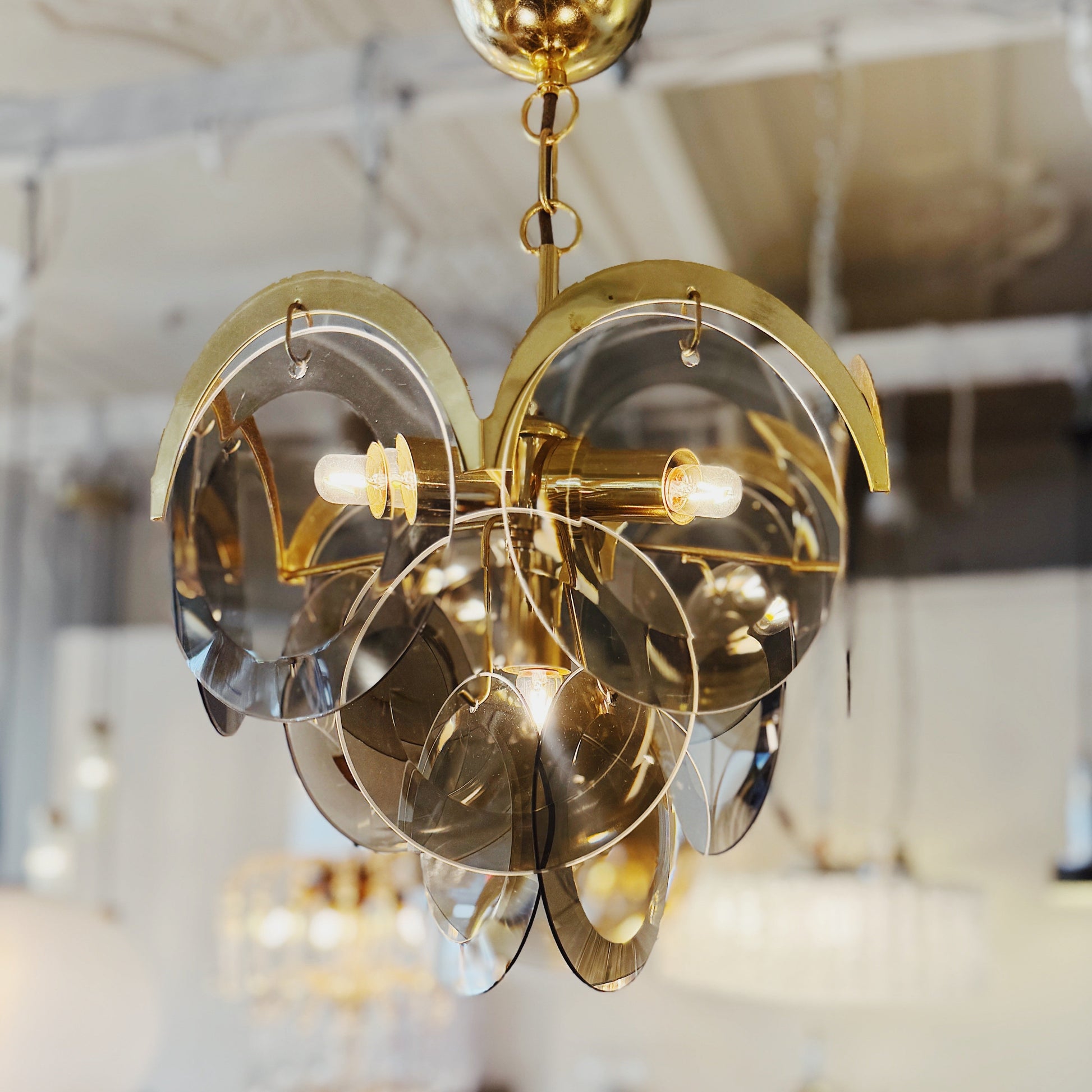 1970s / 3 Tier Smoky Glass Disc & Brass Chandelier