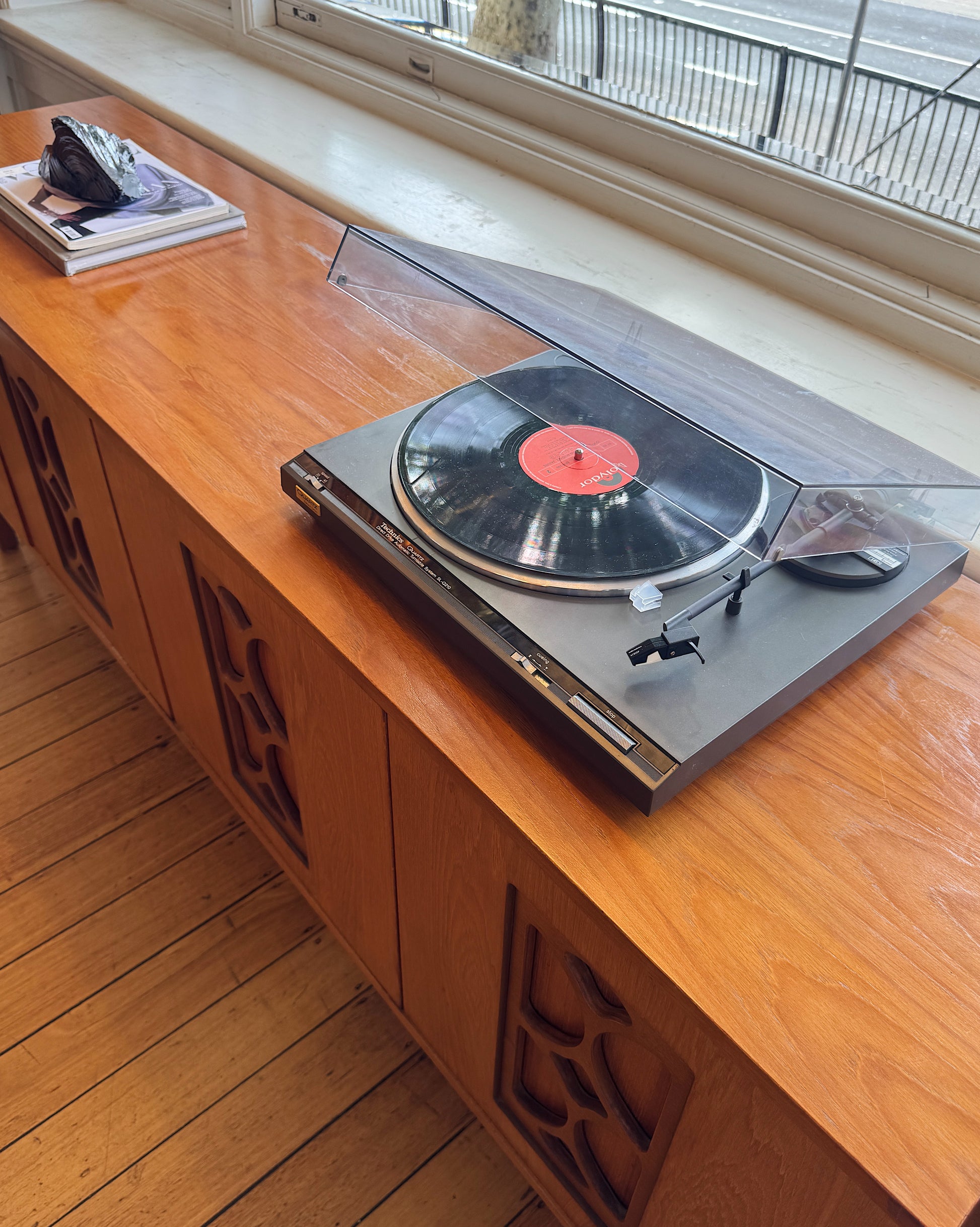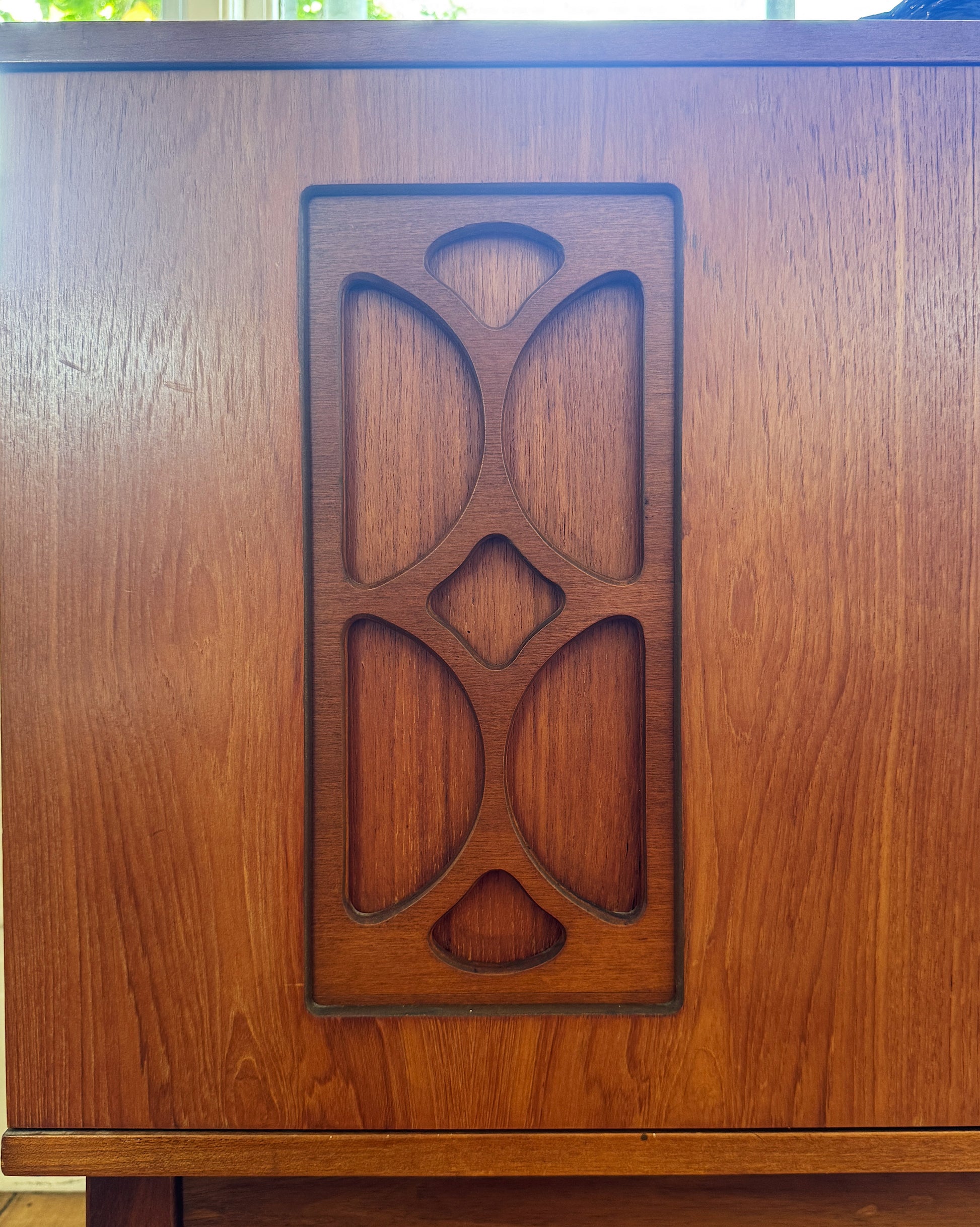 A lovely solid wood mid century sideboard made in Melbourne by Avalon. With geometric detailing on its 4 doors plus internal shelving & drawers, this vintage sideboard is in great original condition.