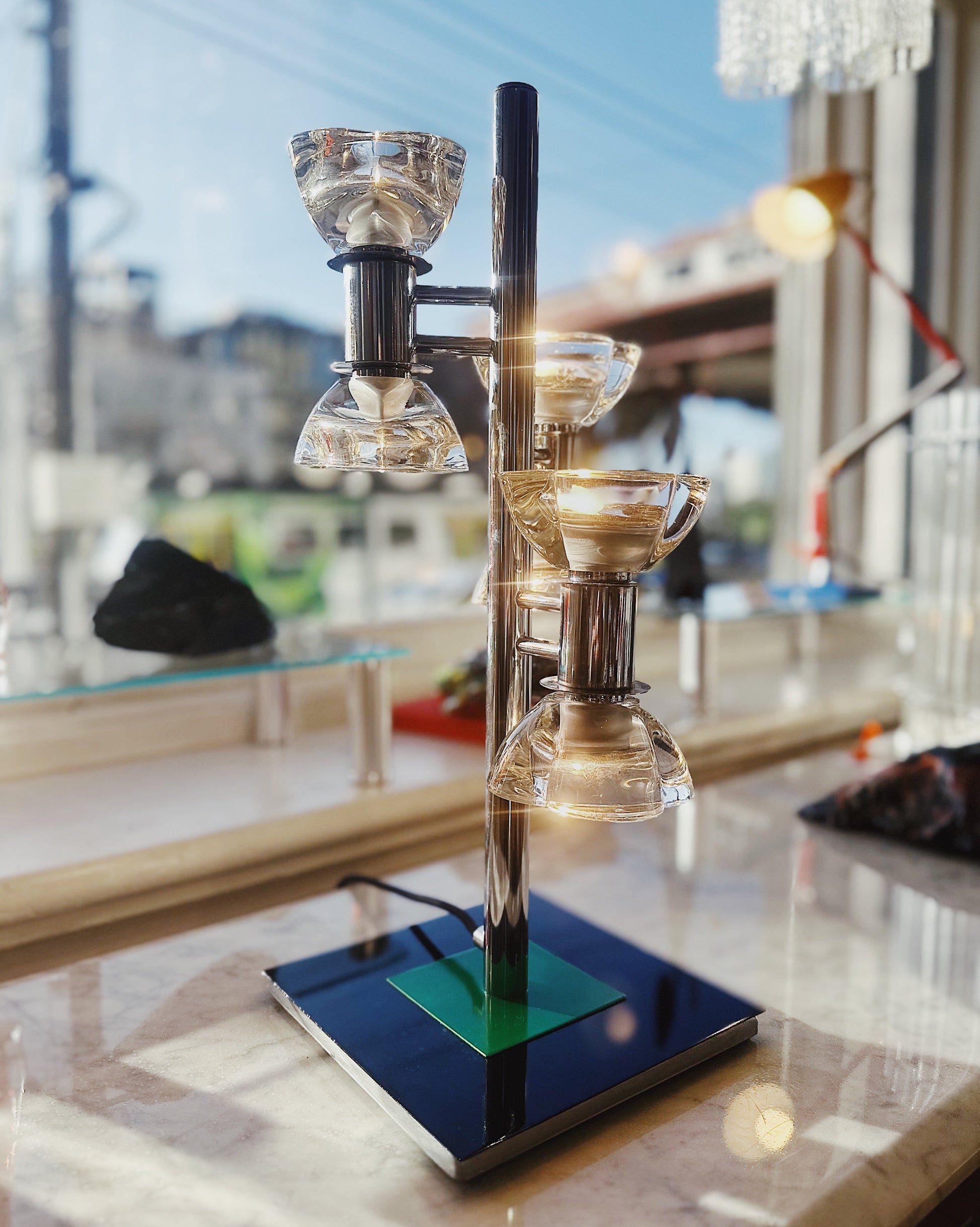 A custom made lamp using 6 high quality Italian Glass florets on a chrome stem with black and green base. A one of a kind piece. In excellent condition.