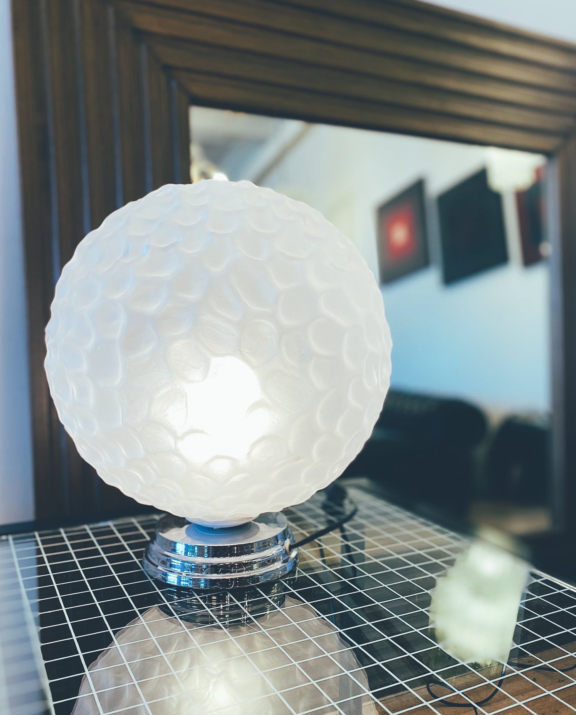 Large spherical table lamp with frosted and dimpled glass shade and tiered chrome circular base.