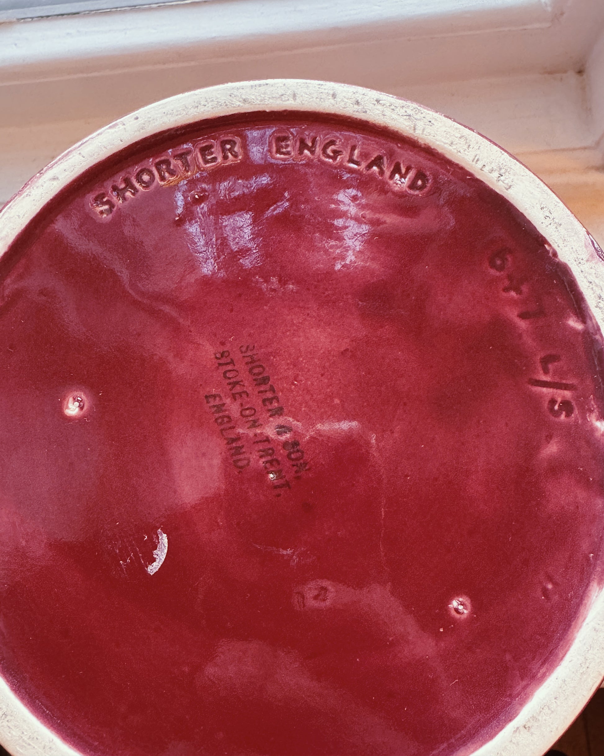 Shorter & Son, England pottery vase in burgundy with light lilac splatters.