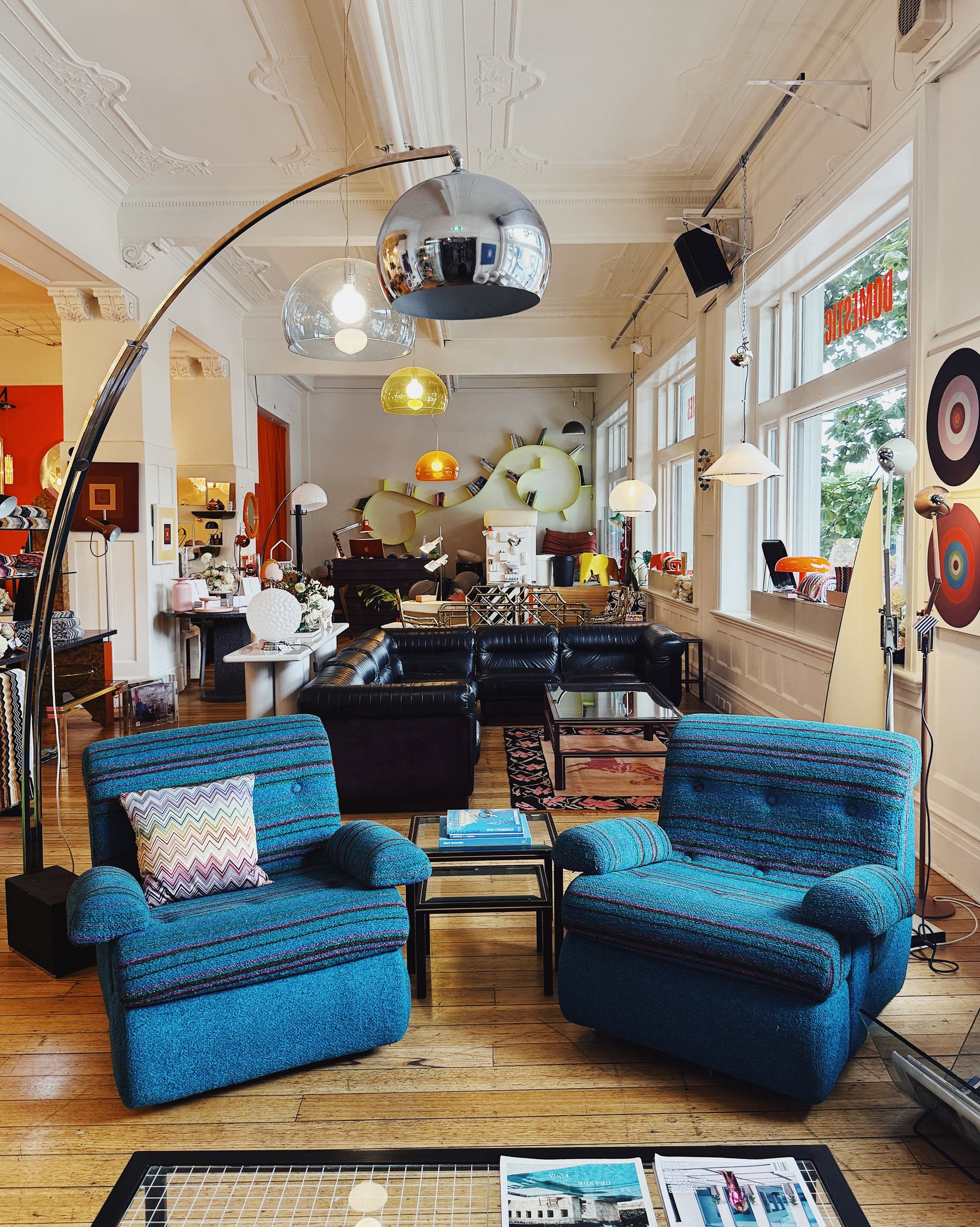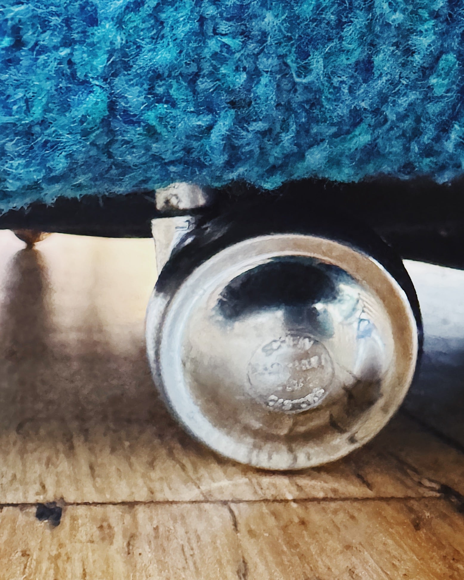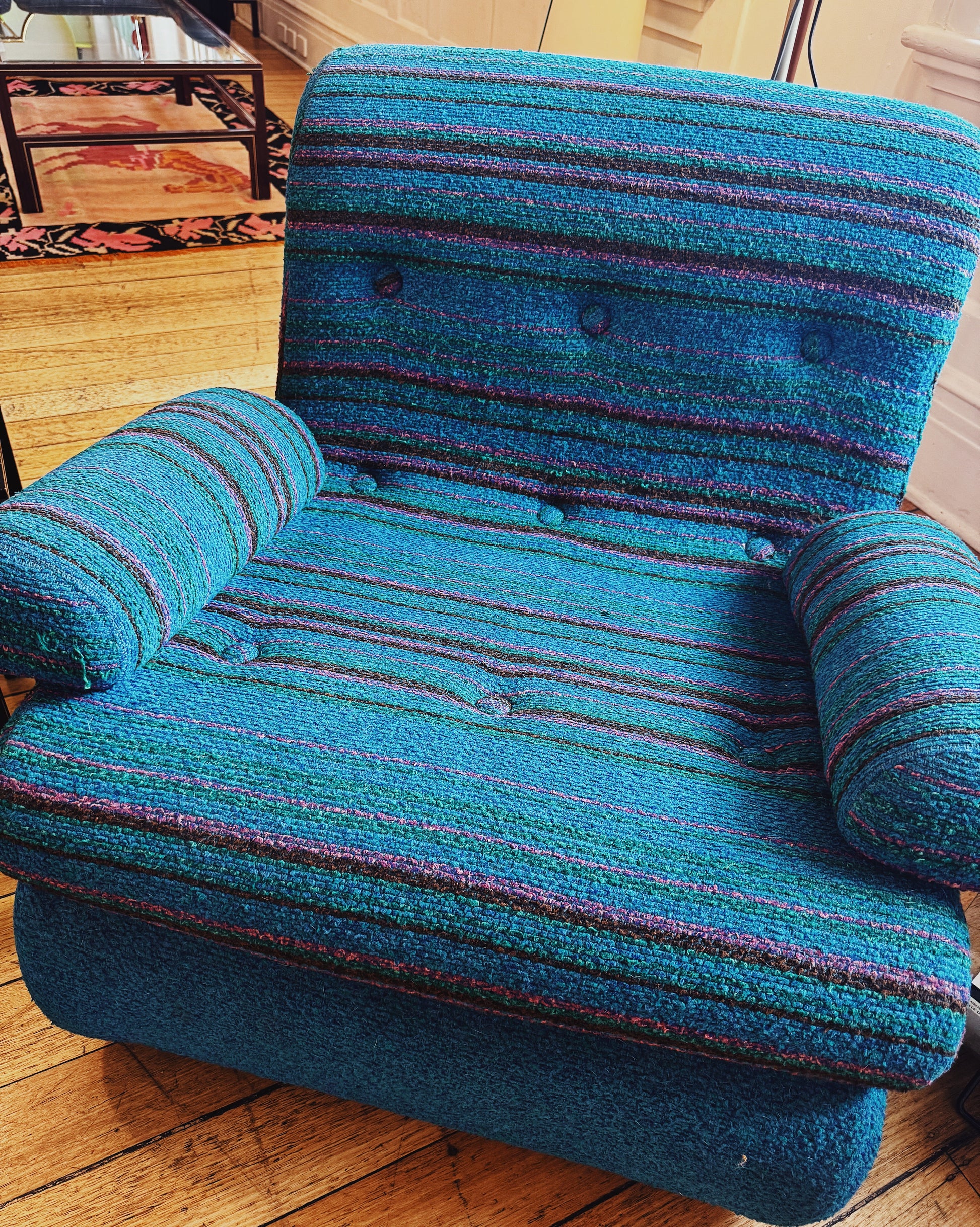 1970s woven fabric chairs in Turqoise blue with pink/purple, green & brown marle stripes. Super comfy and on original castors.