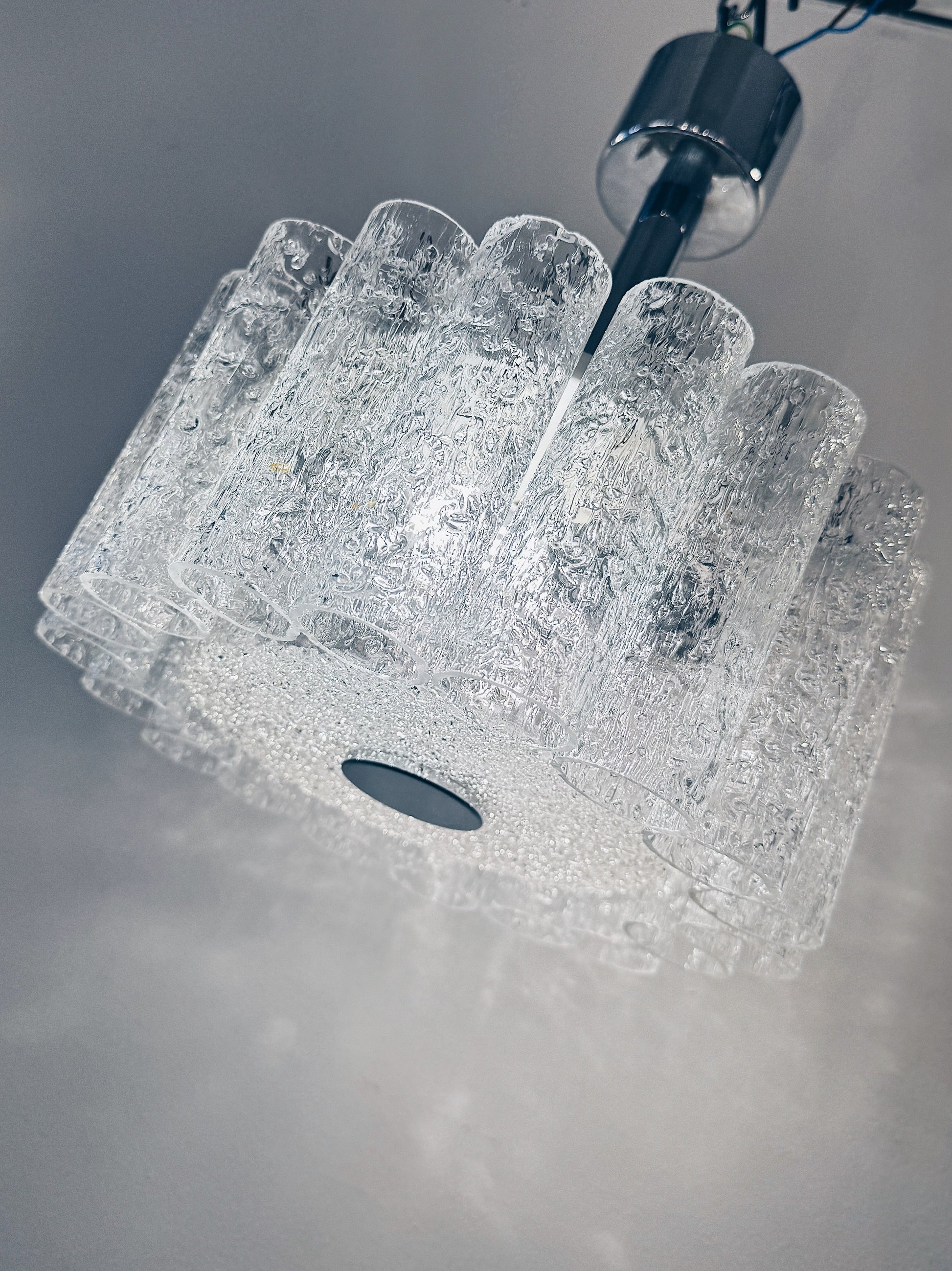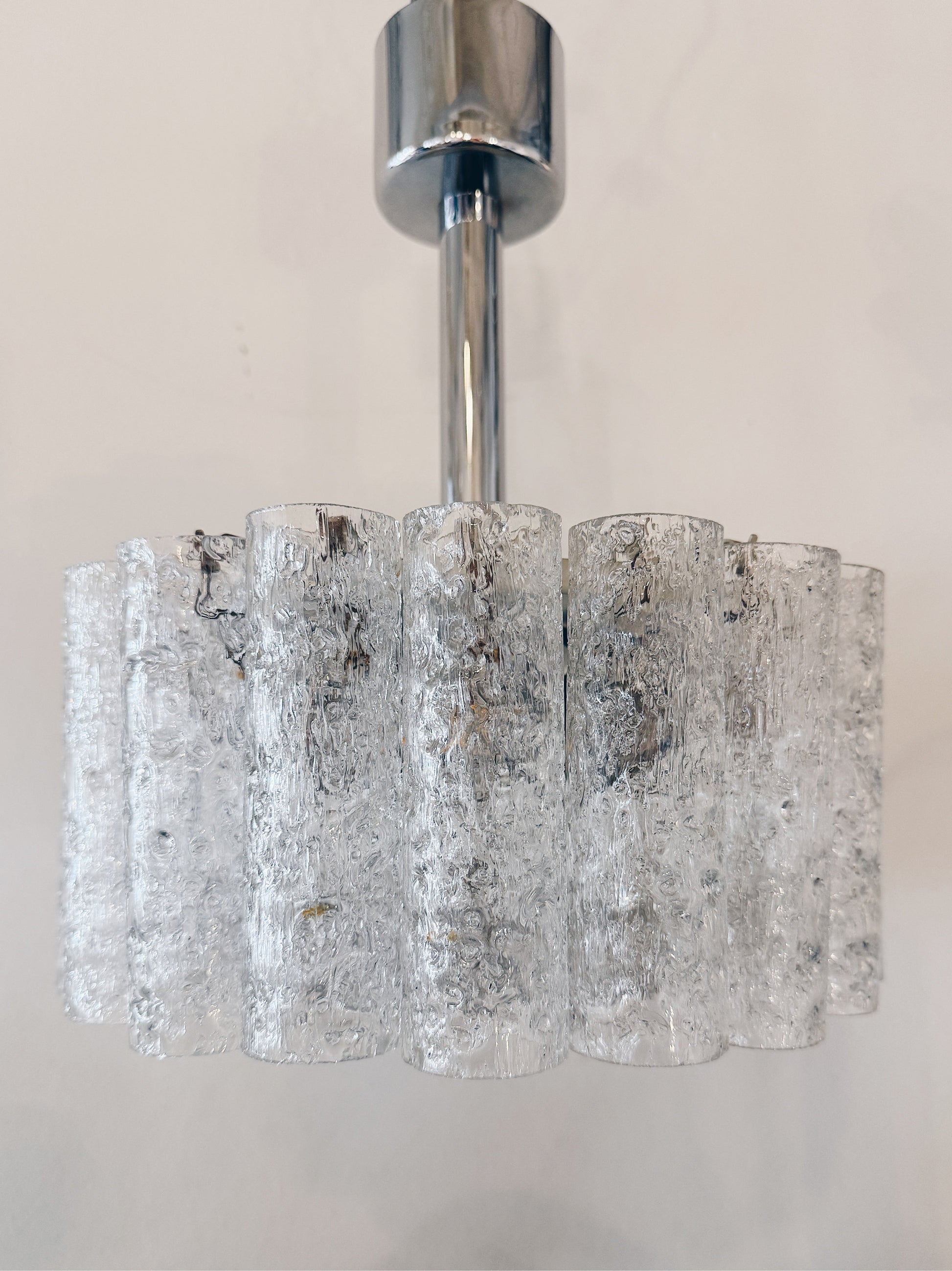 Small Doria Leuchten chandelier with chrome stem and hand blown glass prisms. Throughout the 1960s Doria Leuchten, Germany, produced these glass tubed chandeliers. This small iteration has a single tier of tubes and a matching textured glass bottom plate.