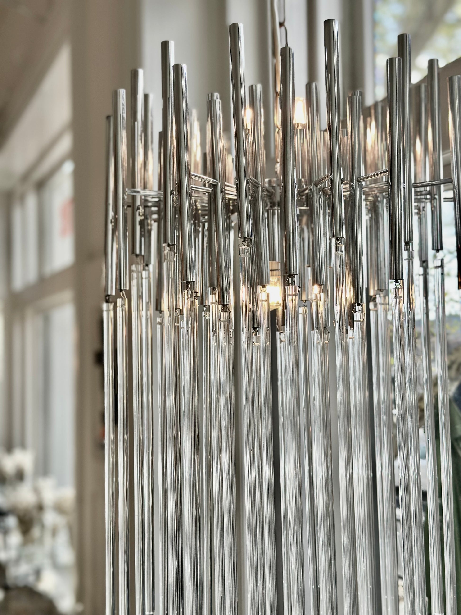 The vertical rods form a shimmering curtain around the central lights, catching and refracting the glow for a waterfall effect. Architectural yet airy, it brings sculptural drama and soft radiance to any large space.