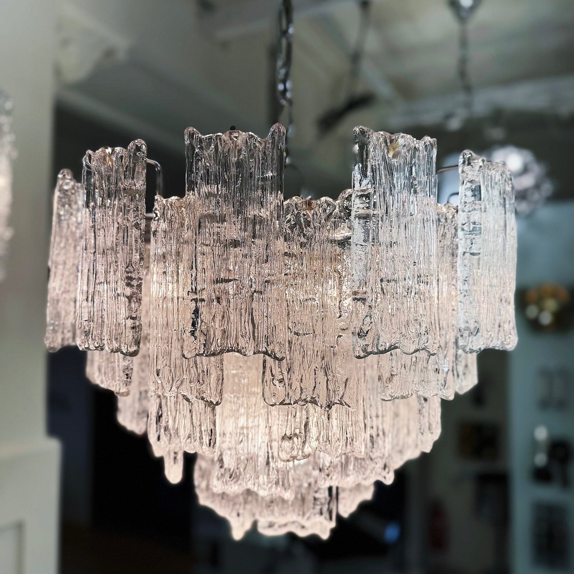 One of three beautiful ice glass light fixtures by Kalmar, Austria, manufactured in the late 1960s. Each chandelier is made of over 50 massive ice blocks which are mounted on a chrome metal frame with matching chrome chain and canopy. Chain can be adjusted.