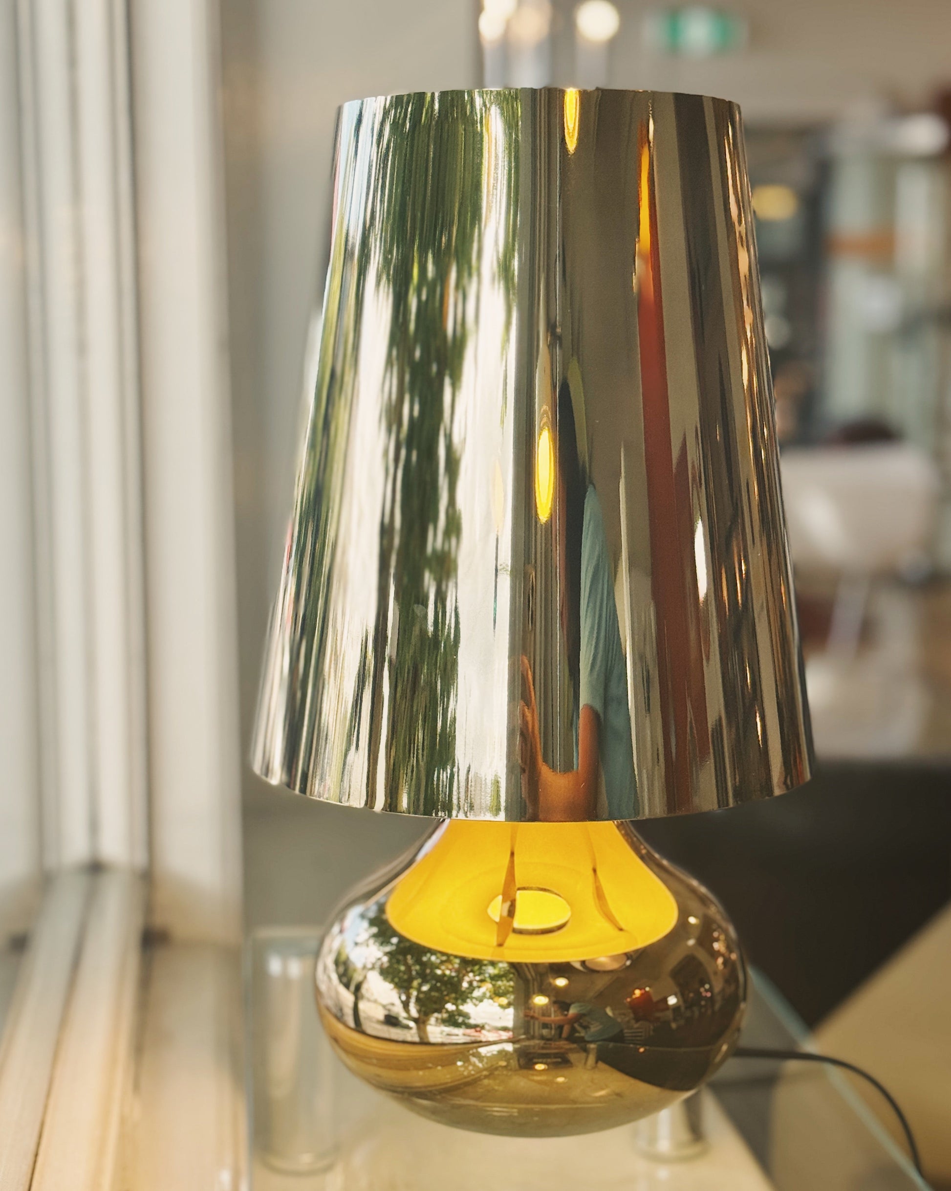 BNIB Cindy lamp designed by Ferruccio Laviani for Kartell. Just one available in the perfect metallic gold, the Cindy is inspired by the lamp shapes of the 70s with ultra modern materials. Her special feature is the shiny chrome-like finish that radiates a multitude of iridescent reflections.