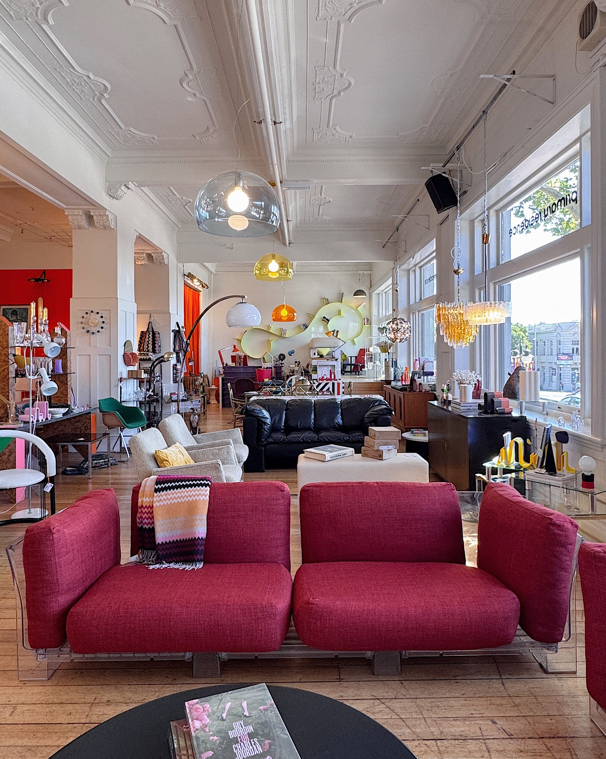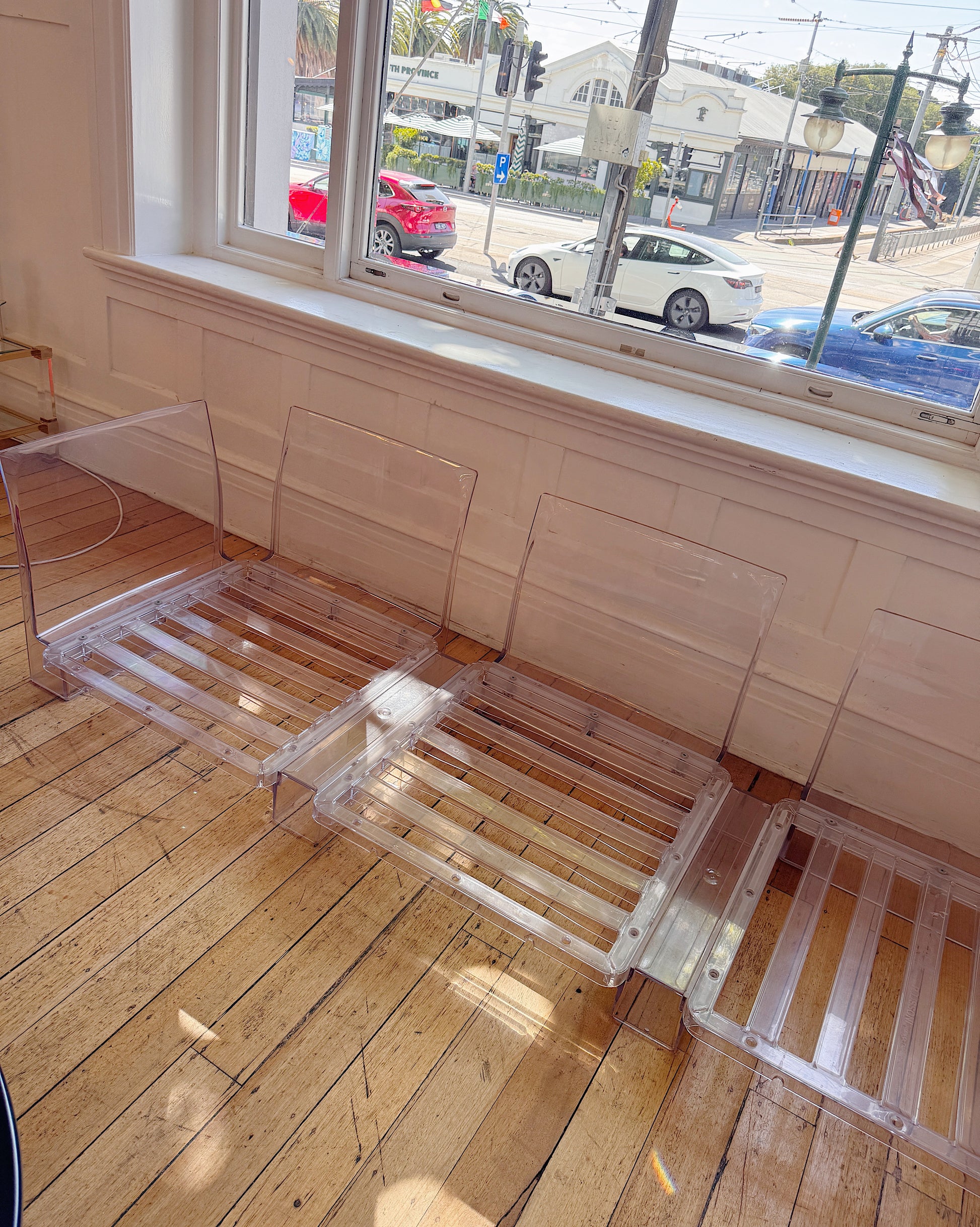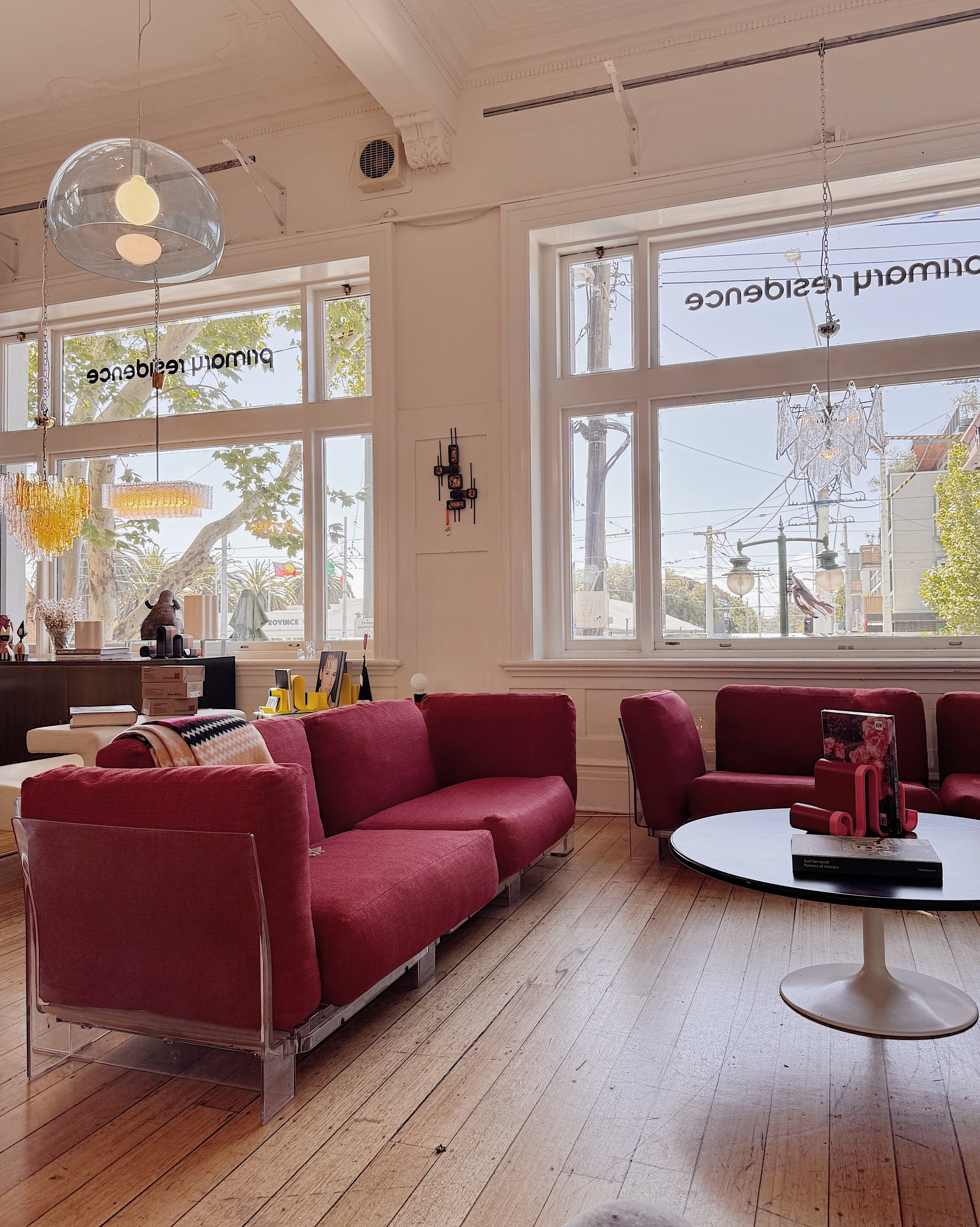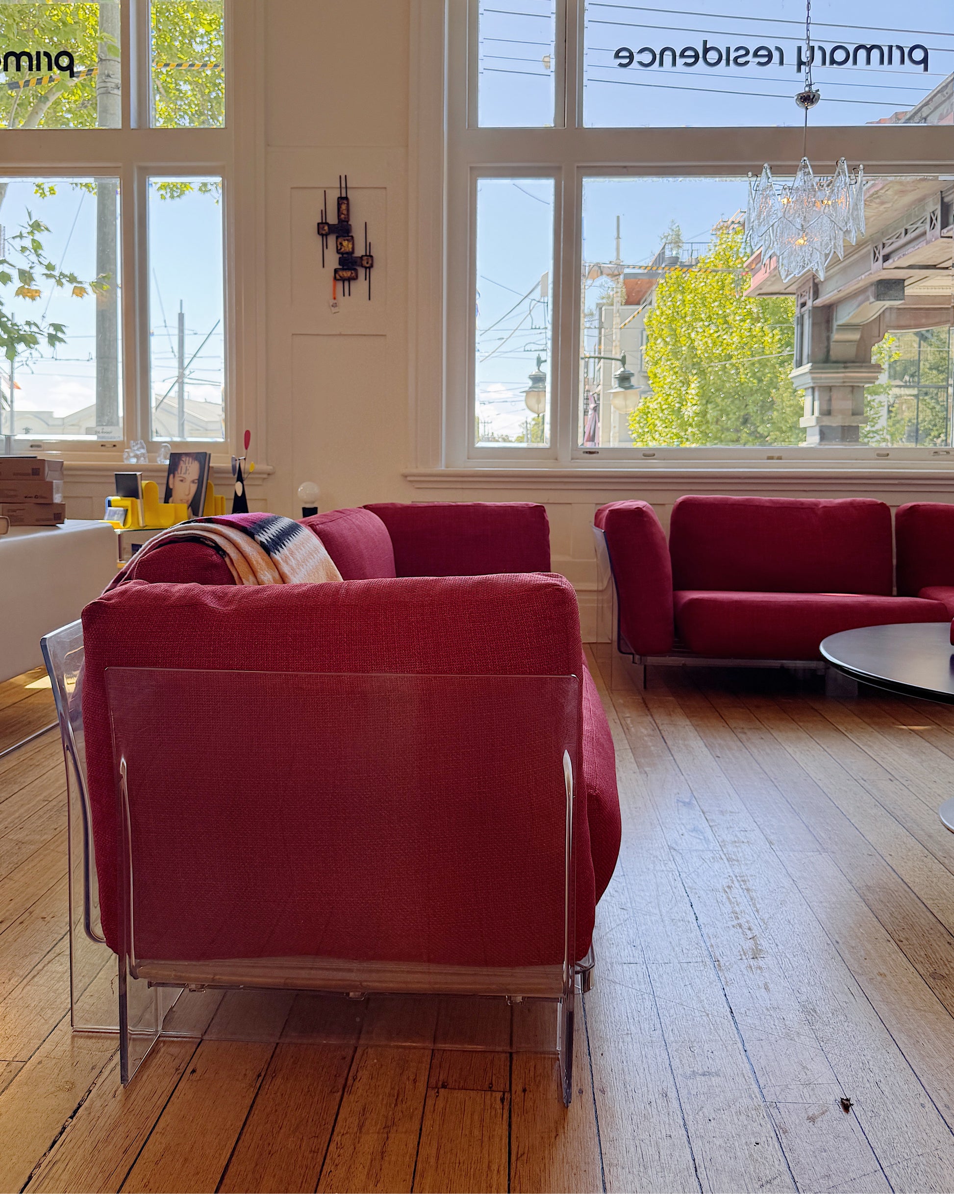 A richly reupholstered Kartell Pop Sofa for undercover outdoors or a sunroom. This Italian designer 3 seater sofa has a heavy acrylic base with a tweed style upholstery in a ruby red colour. It is in excellent condition with only minor, non structural imperfections to the acrylic. It is marked and authentic.