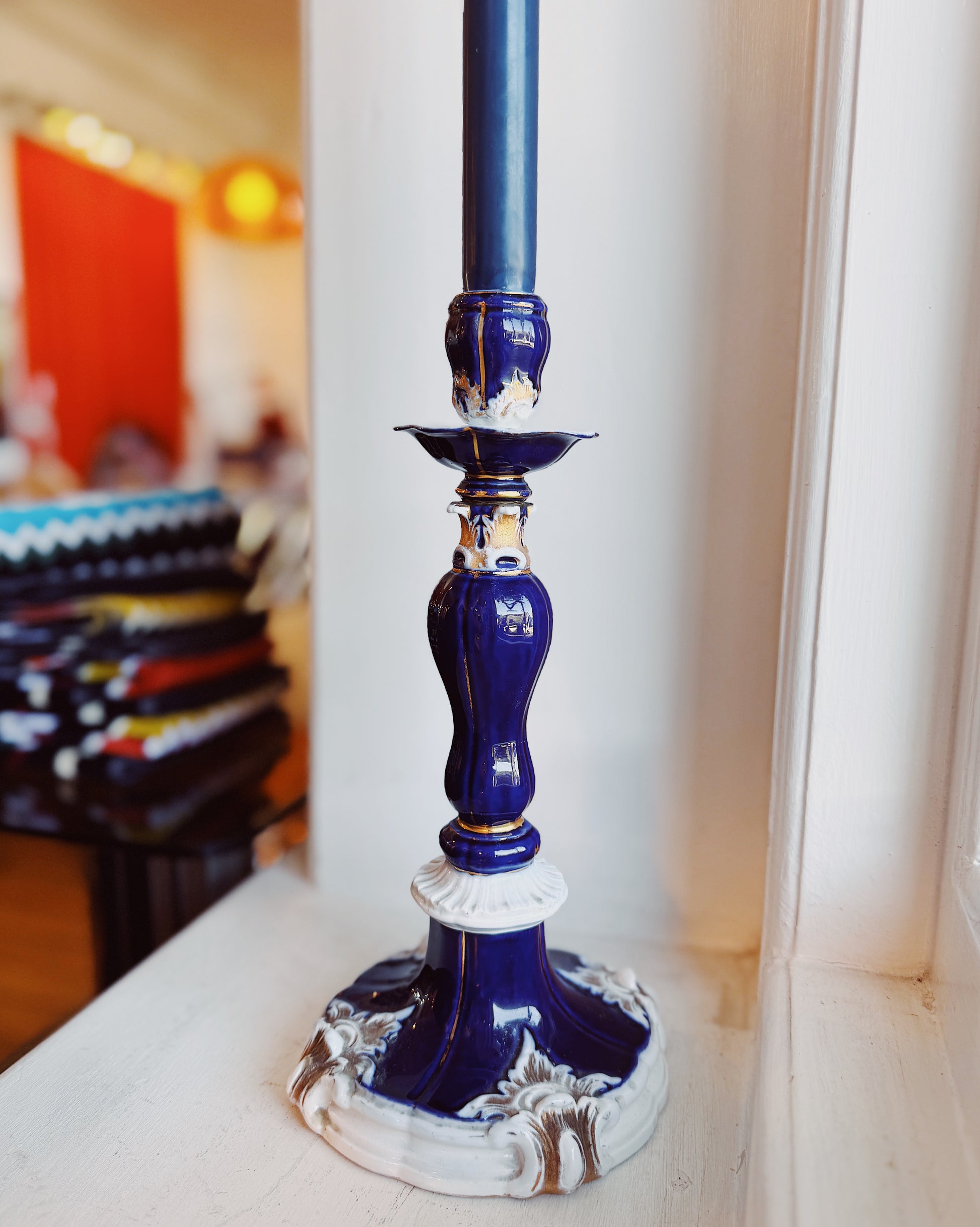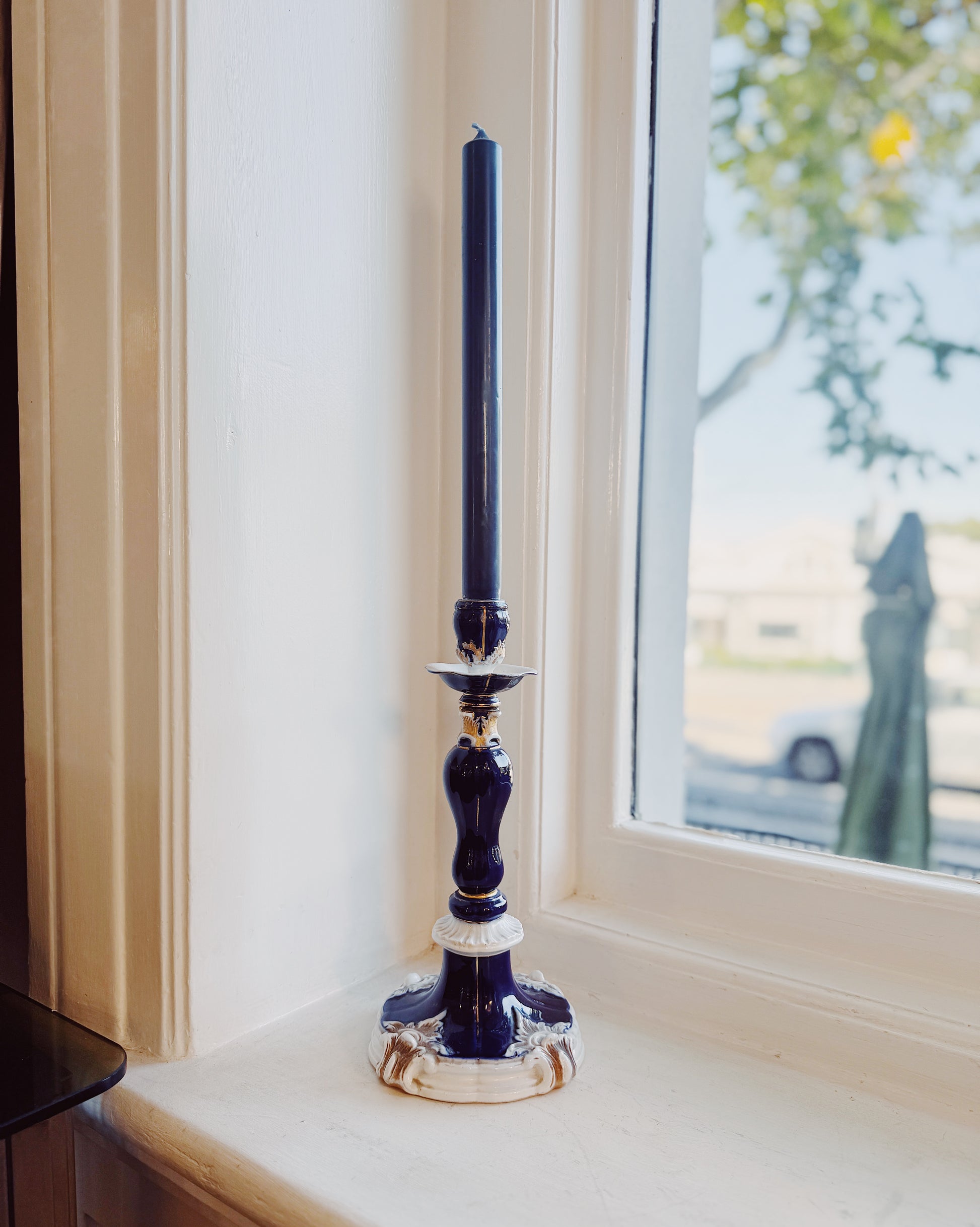 A single Meissen porcelain candlestick, comes with 1 x Trudon blue candle.