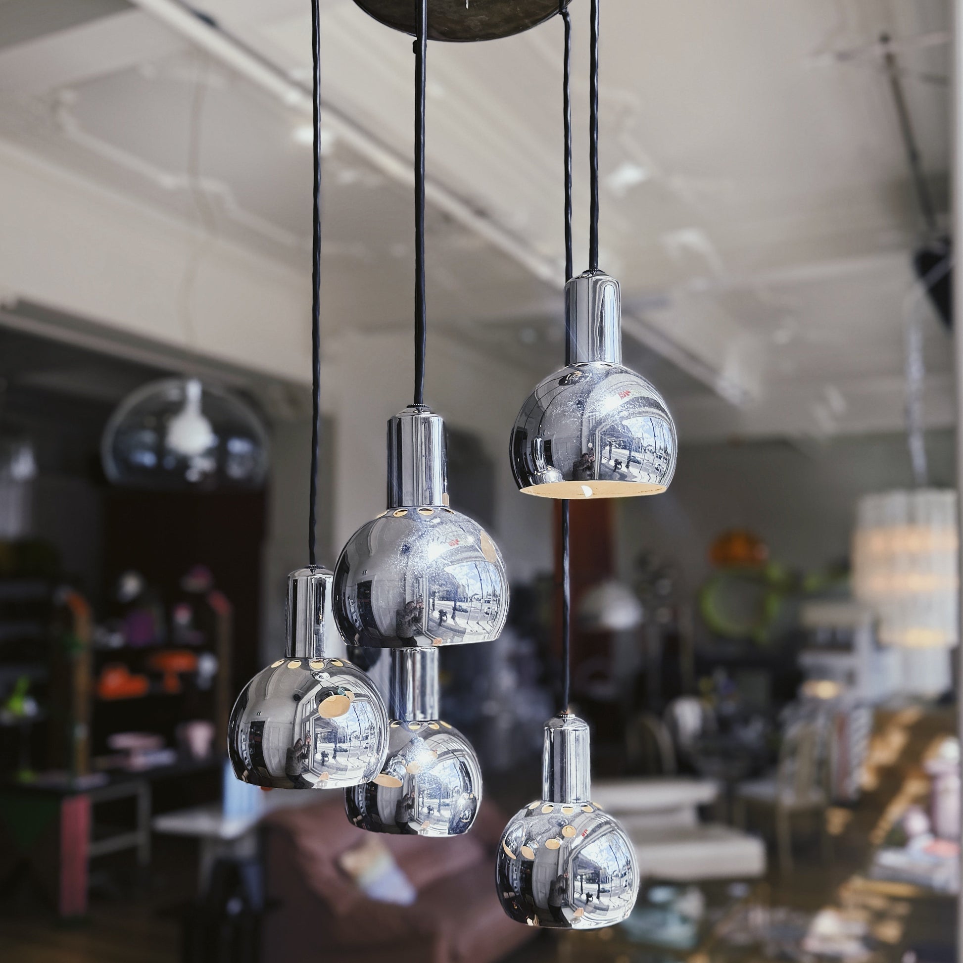 An original Mid Century cascading pendant in excellent original condition. 5 drops of pristine chrome shades with a chrome canopy and black cables. The cables can be lengthened or shortened to create different arrangements with the drops.