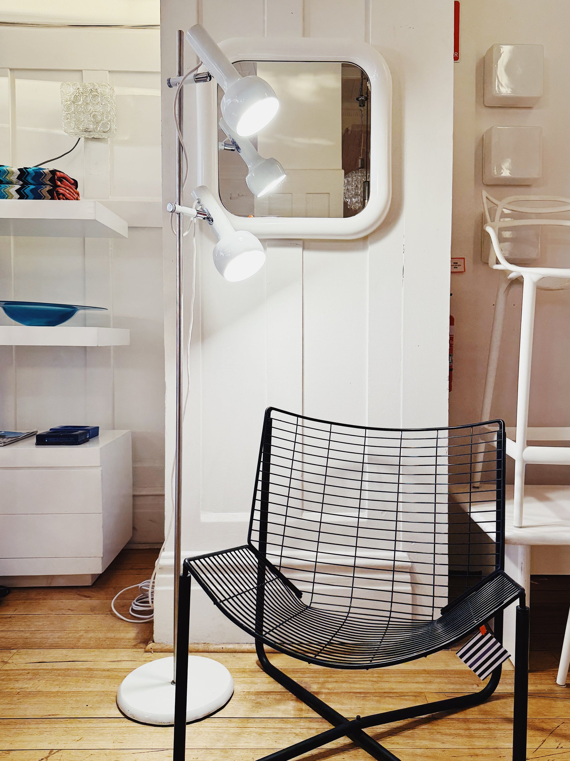 1970’s Oslo Australia mid century dual head floor lamp. Original cables and markings. Both lamp heads are adjustable to face in all directions and feature individual on/off switches on each lamp head. Tulip base, an iconic Scandinavian design with Australian craftsmanship. Original gloss white and chrome.