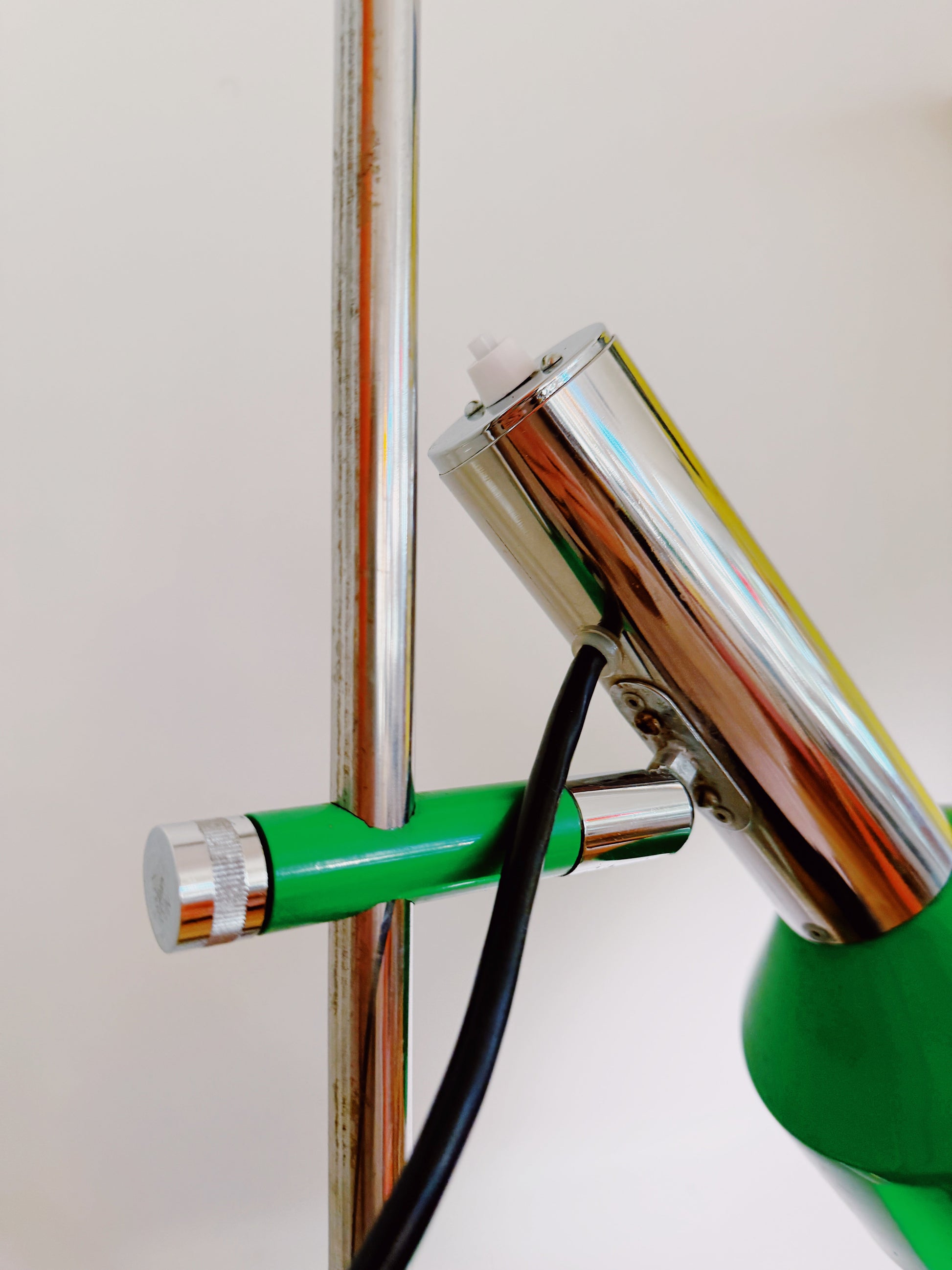 70’s Oslo mid century dual head floor lamp in grass green and chrome. Black cable, green base. Both lamp heads are adjustable to face in all directions. This item has scratches, marks and dents consistent with age.