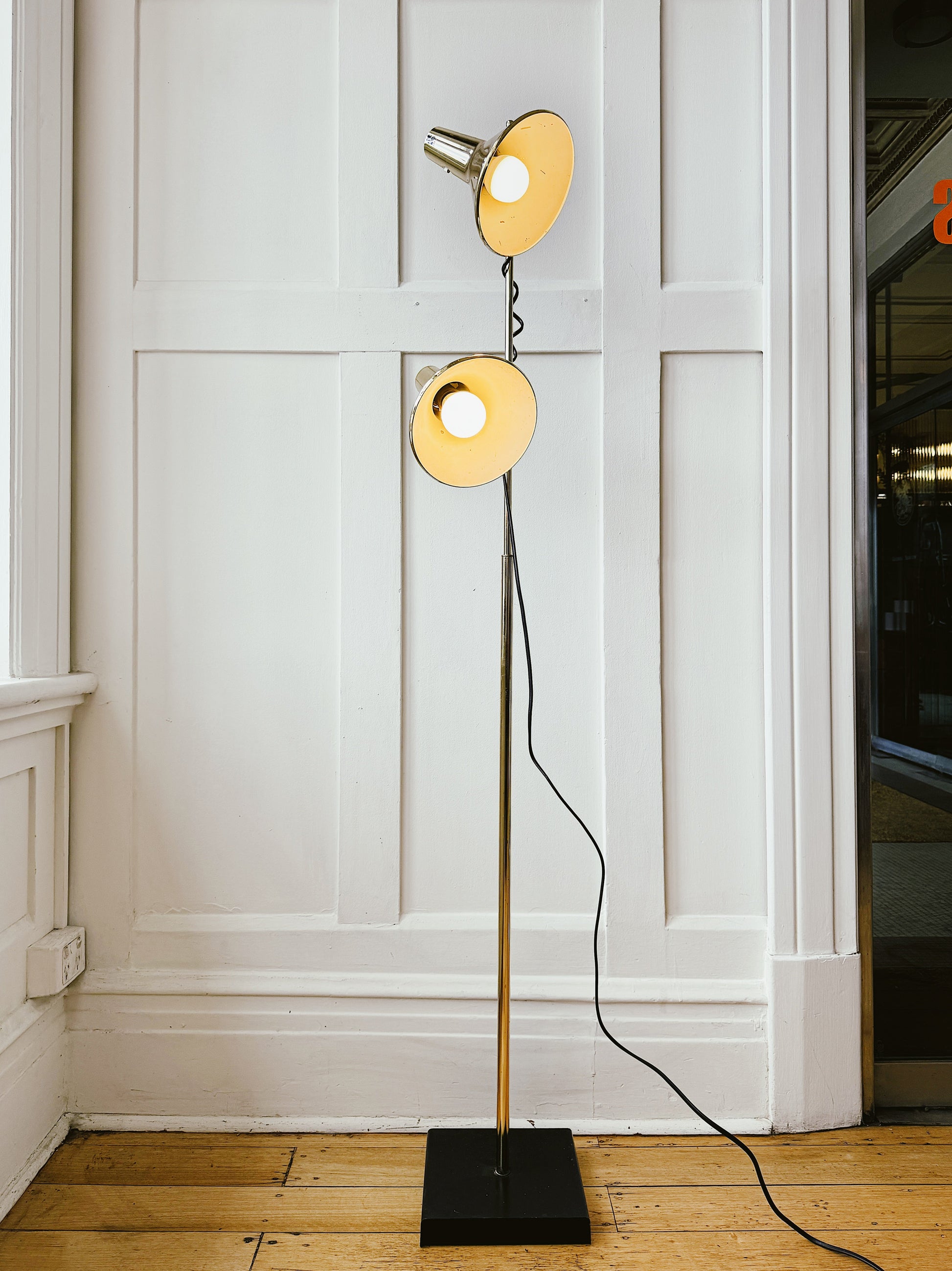 Rare Planet ‘Model P’ Twin Spot Floor Lamp, in gold chrome by Planet Products. This Australian piece of design history, circa 1980, features gold plated exterior and black spiral cord detail. Super elegant and modern with chic black metal square base. Good vintage condition.