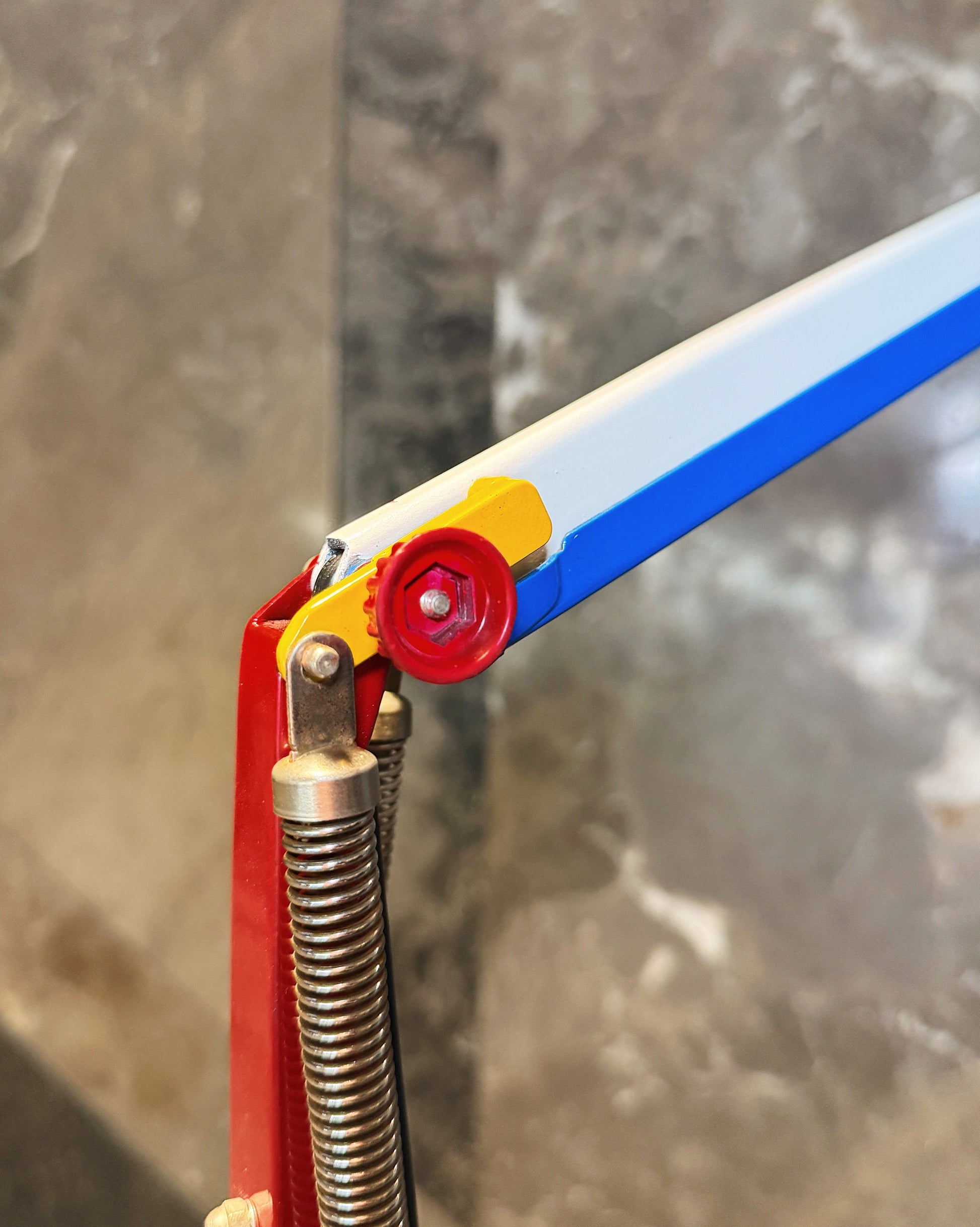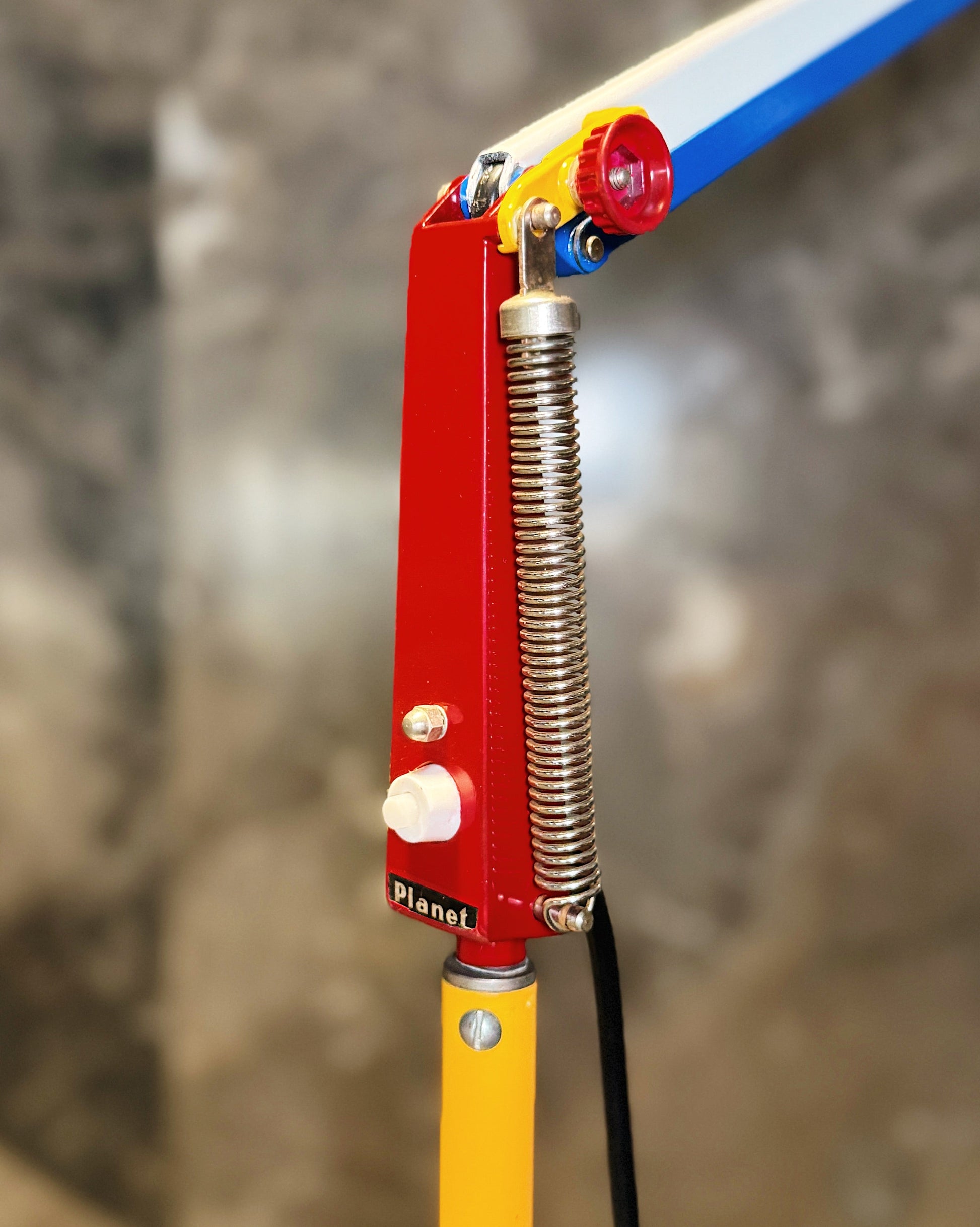 This lamp has been fully refurbished with brand new paint colours chosen by us in the manner of Piet Mondrian. Electric Blue, Burgundy Red, Yolk Yellow and white with black cord.