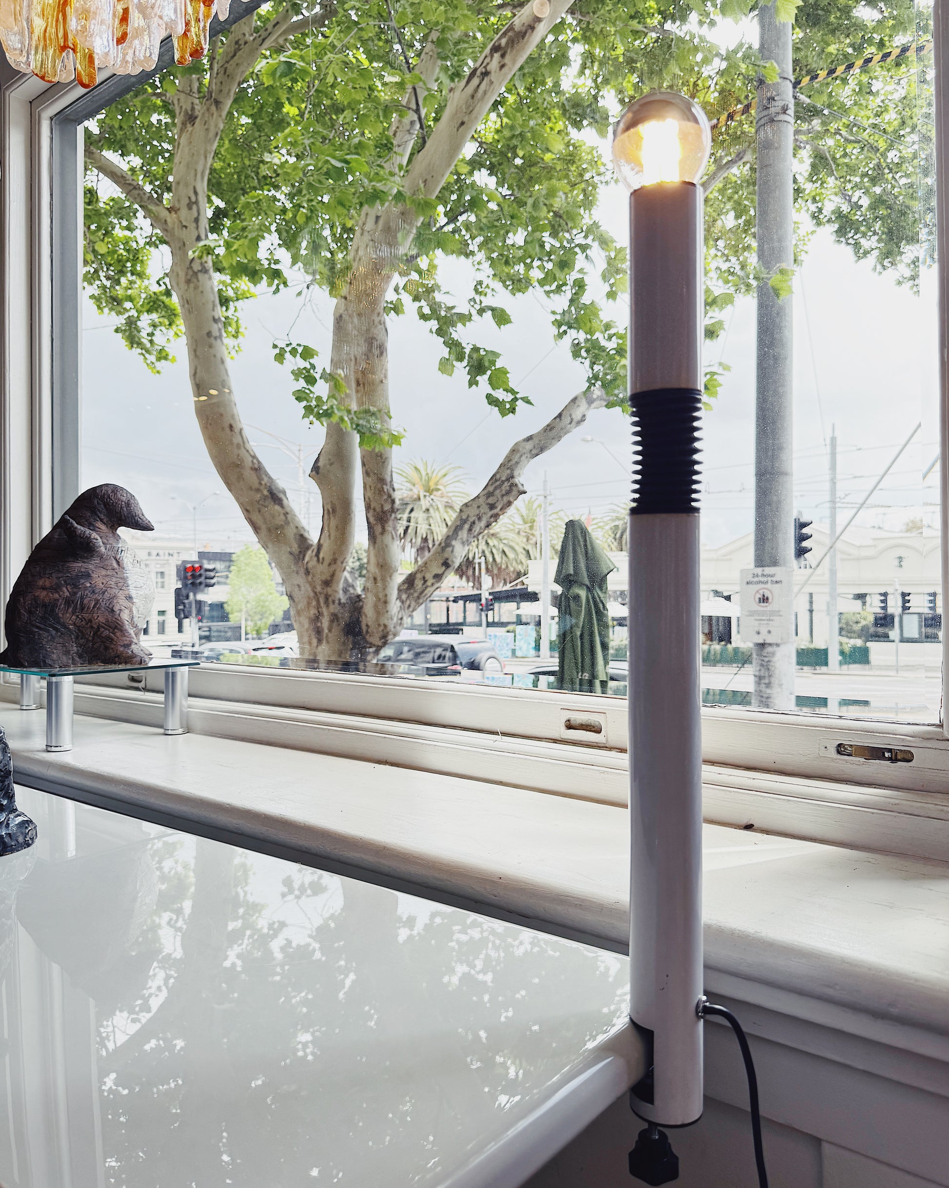 A high gloss white 1960s lamp that clamps on a table, desk, console or shelving. Space Age design with a bendable gooseneck for directional light.