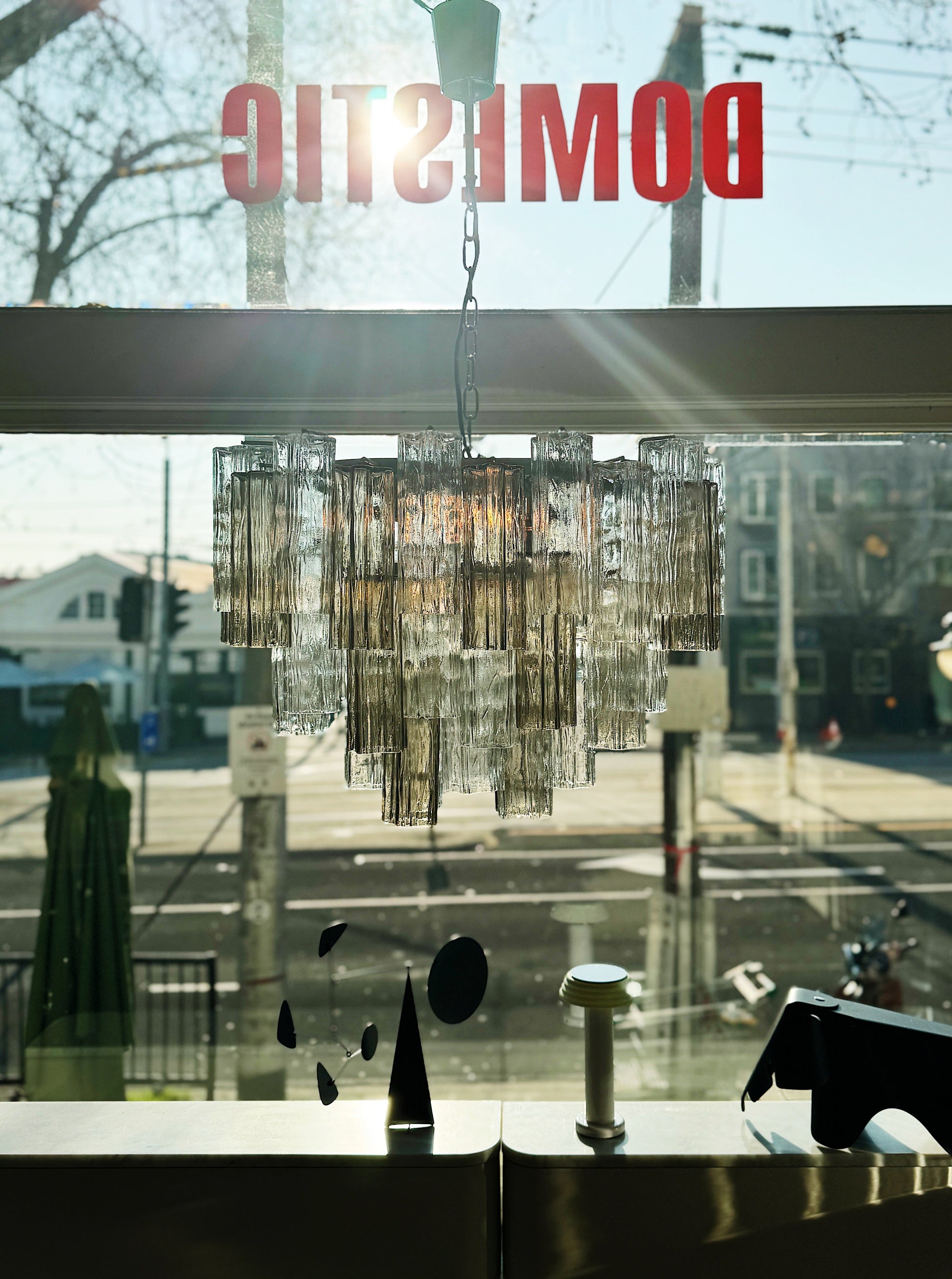 An authentic vintage clear glass oval tronchi chandelier on a chrome chain with chrome canopy and two tone glass. Smokey grey and clear glass tronchi.