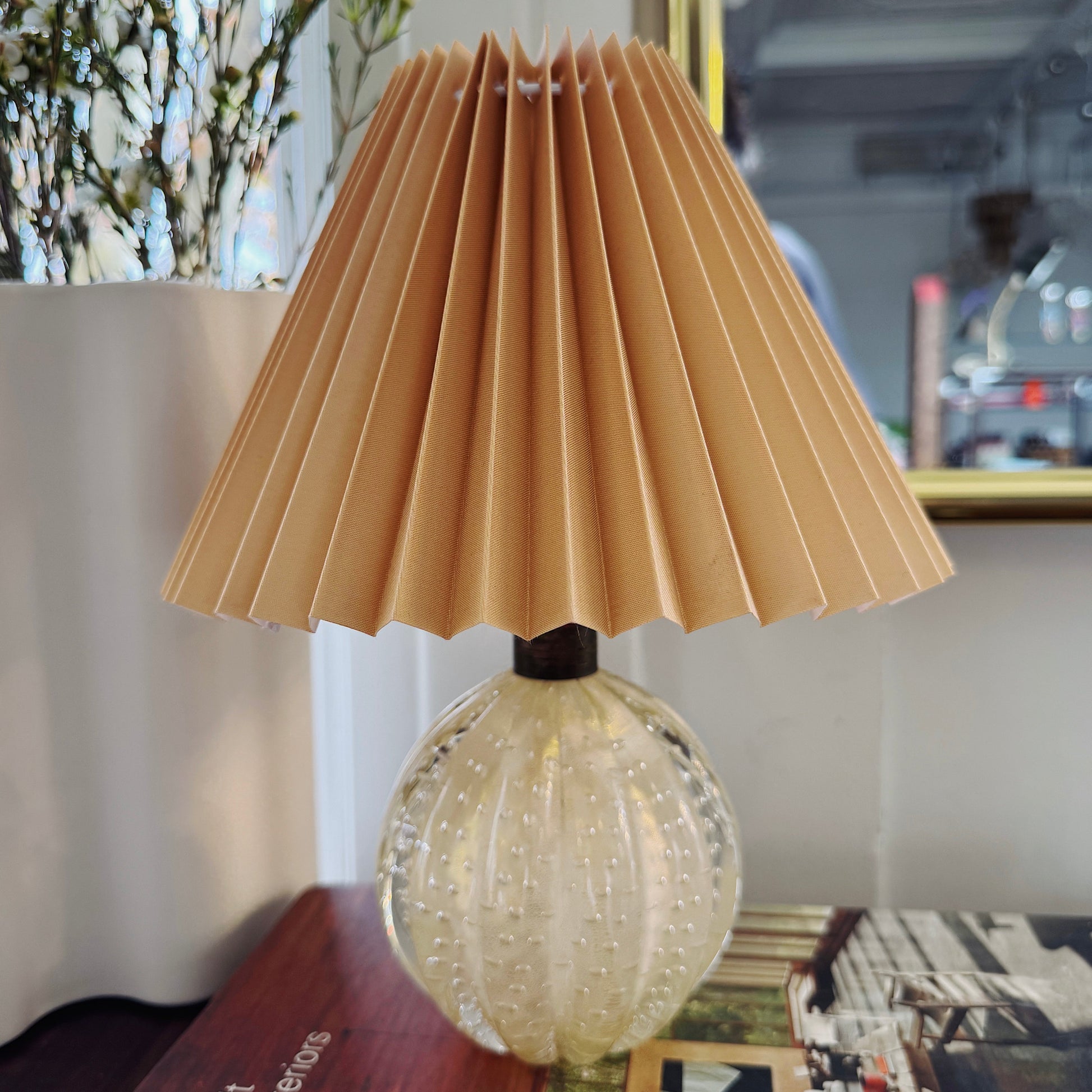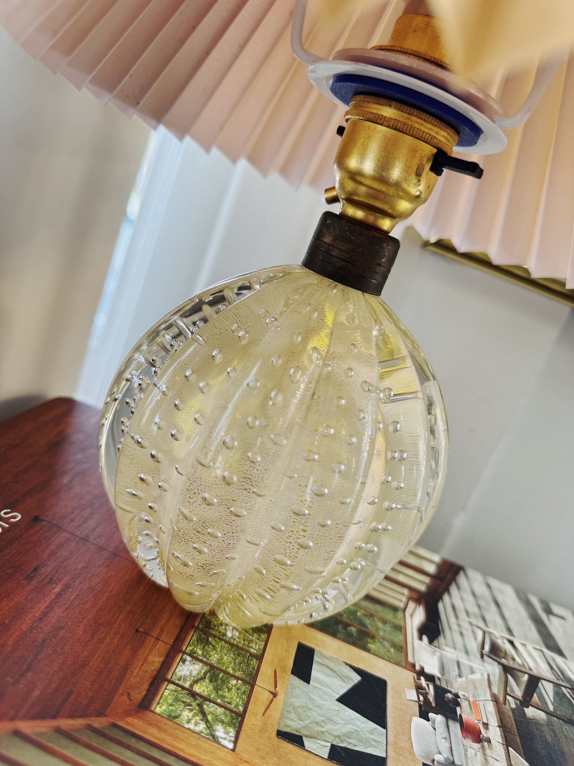 A Venetian speciality, the bubble technique of glass making with 24K gold leaf shimmering throughout. The lamp base is solid glass, fitted with a brass lamp holder + pleated gold lamp shade.