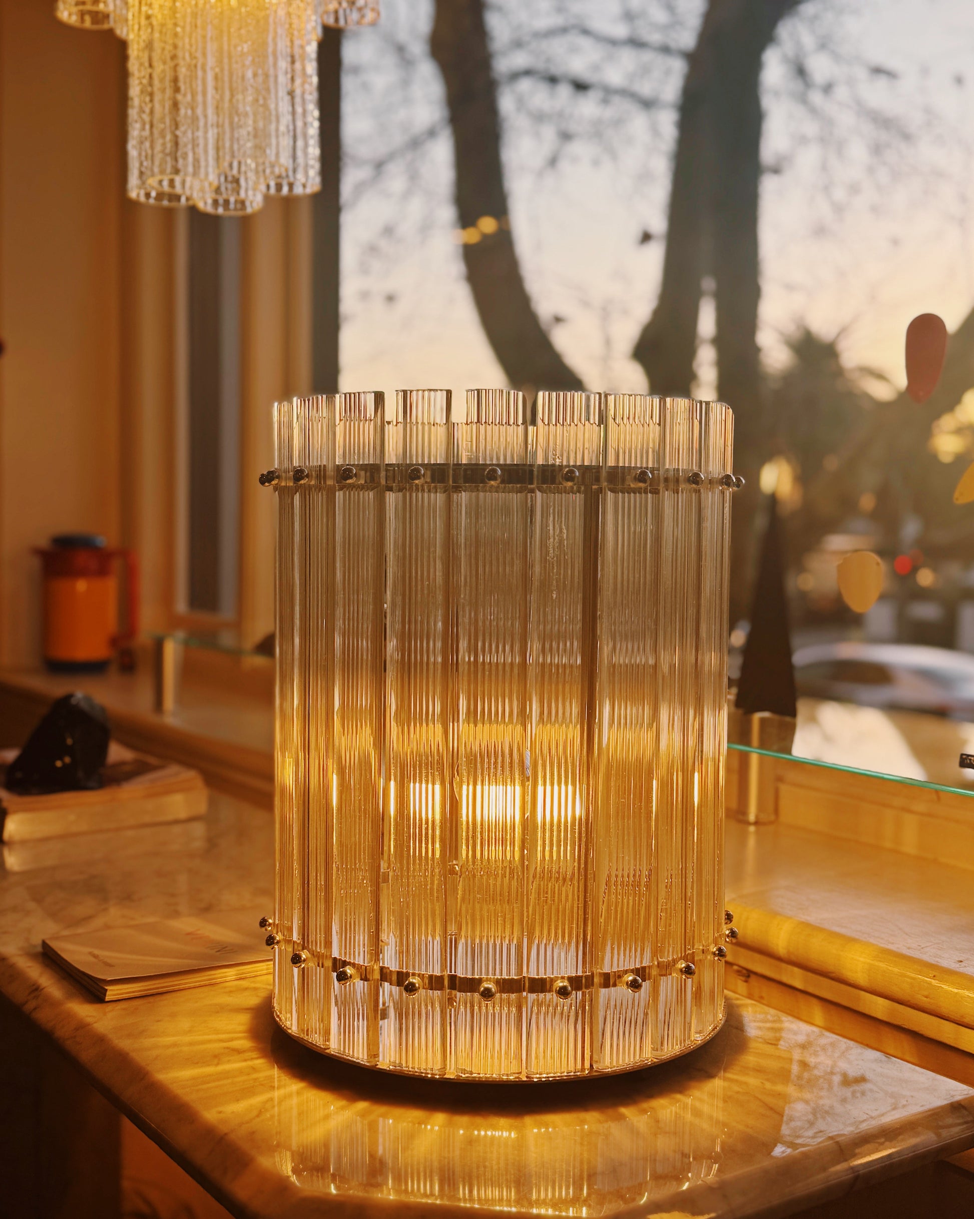 The Venini Nastri Crystal Glass Table Lamp is a masterful example of Murano glass craftsmanship. Designed by Venini, a renowned Italian glassmaker, this lamp features hand-blown crystal glass prisms suspended from a chrome-plated metal frame. The "Nastri" design, characterized by its vertical ribbed texture, creates a dynamic interplay of light and shadow, adding depth and elegance to any space.