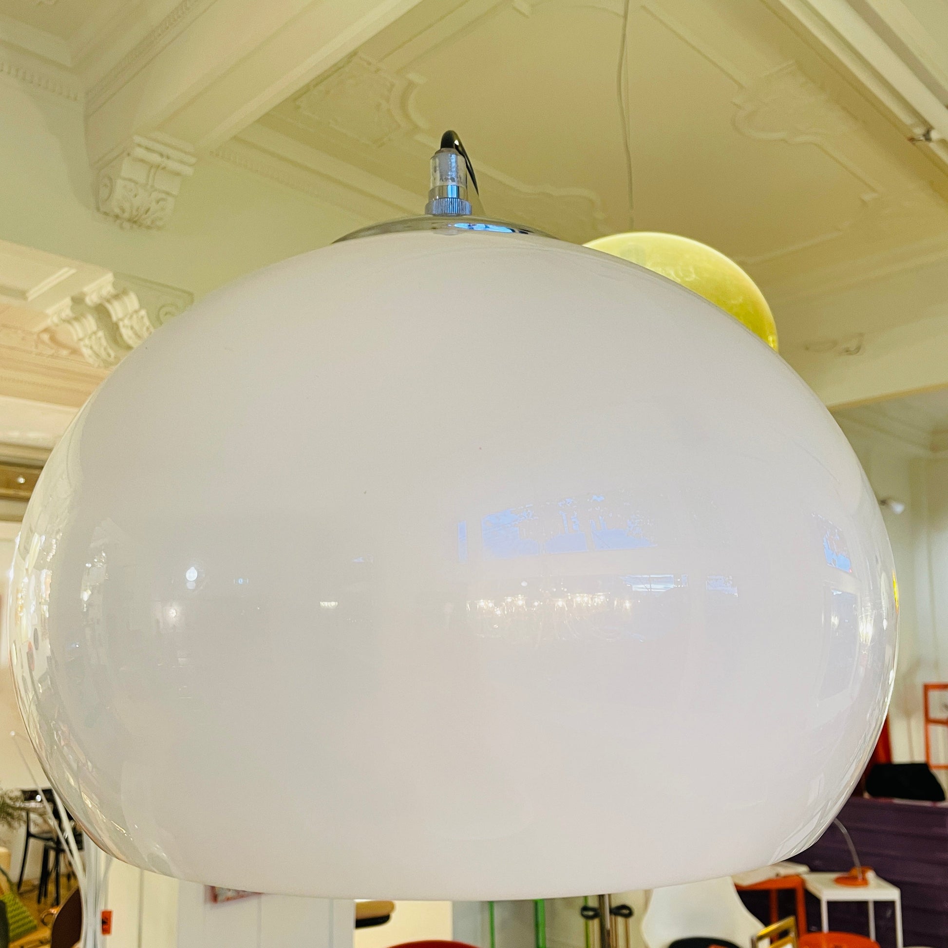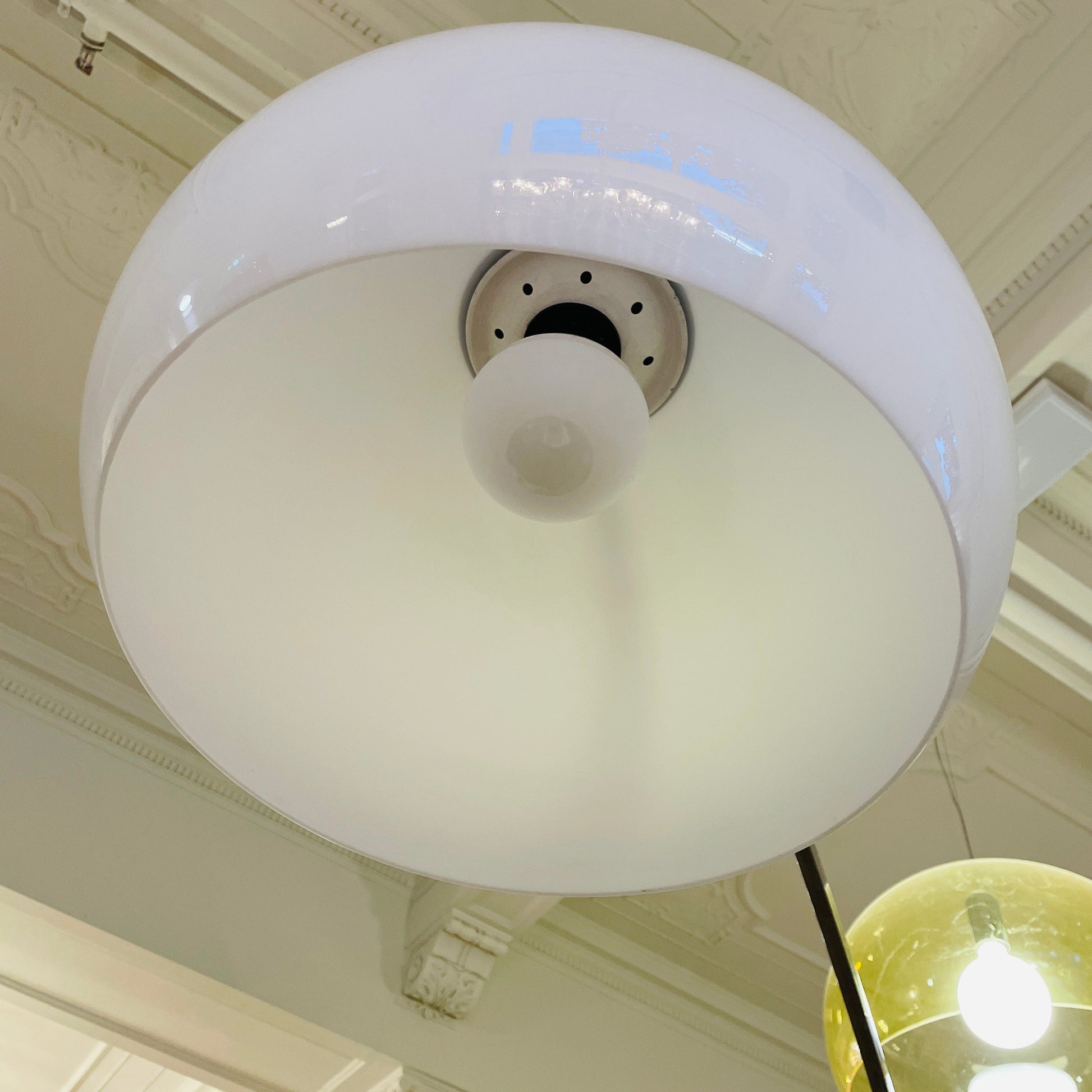 Oft described as being, ‘a ceiling lamp without being a ceiling lamp’, the arch lamp is comprised of two stainless-steel stem pieces that extend like a telescope, stretching to nearly seven feet wide, allowing the lamp to sit easily out of foot traffic. This iteration has a very rare solid rectangular polished travertine stone base in beige & creamy hues. White acrylic dome shade with chrome cap. A beautiful piece bringing elegance into any living space. Black power cord with all black on/off switch.