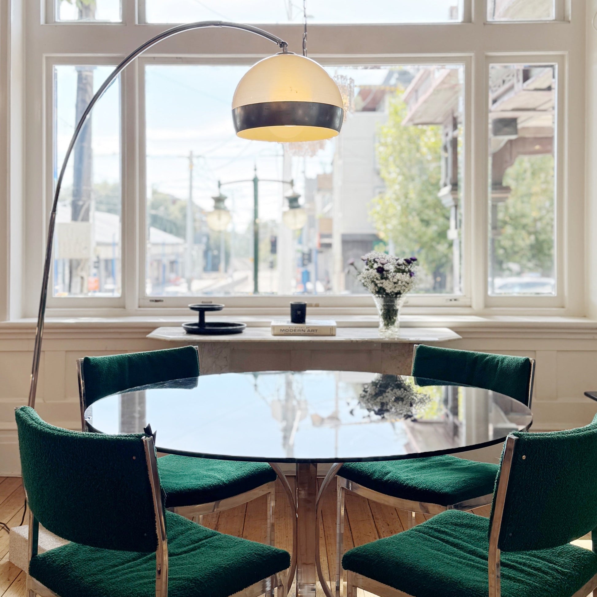 Often described as being, ‘a ceiling lamp without being a ceiling lamp’, the arch lamp is comprised of three stainless-steel stem pieces that extend like a telescope, stretching to nearly seven feet wide, allowing the lamp to sit easily out of foot traffic. This iteration has a very rare solid rectangular pebble stone base in off white & creamy hues. Textured clear acrylic dome shade with silver band. A beautiful piece bringing elegance into any living space.