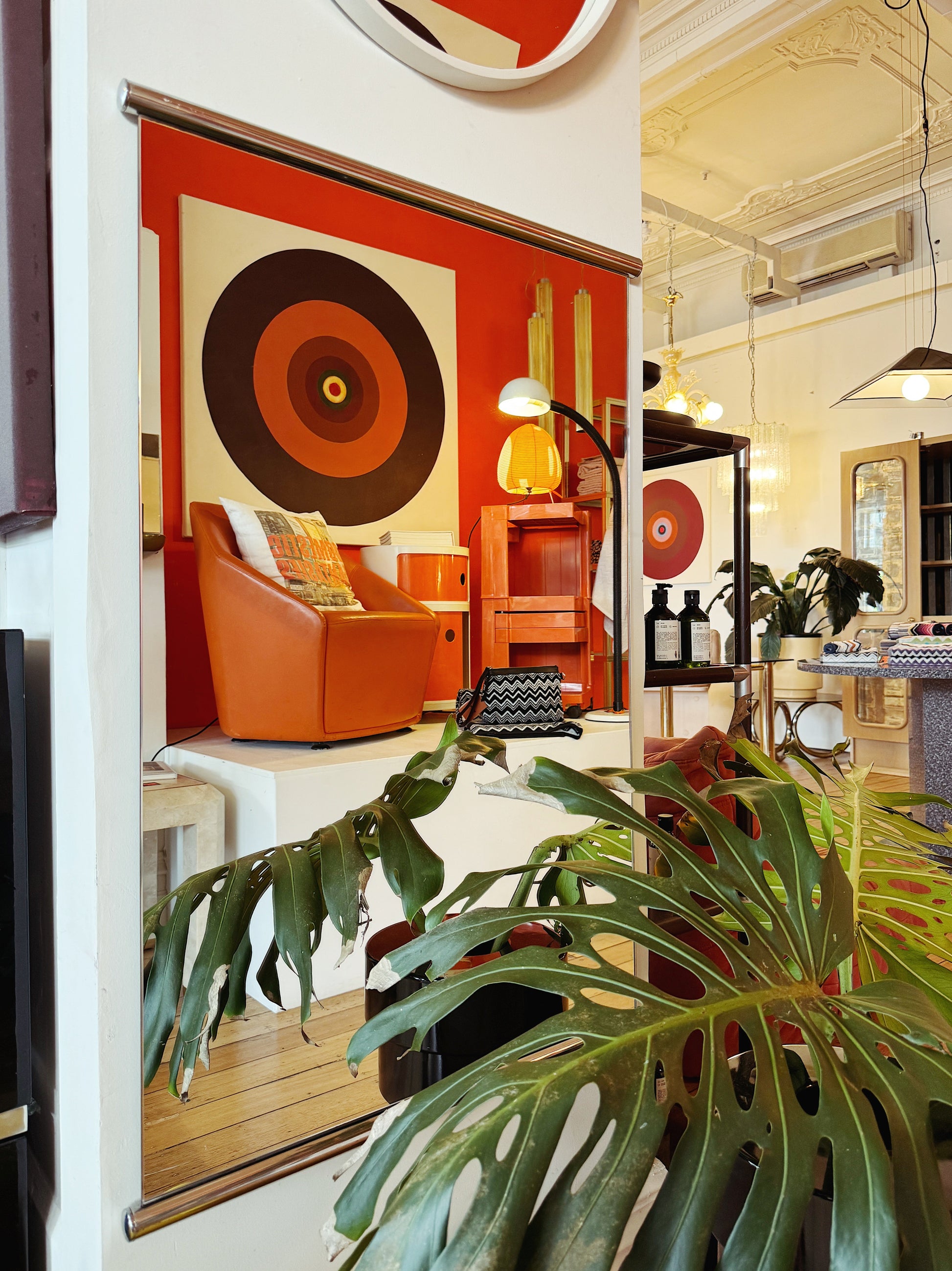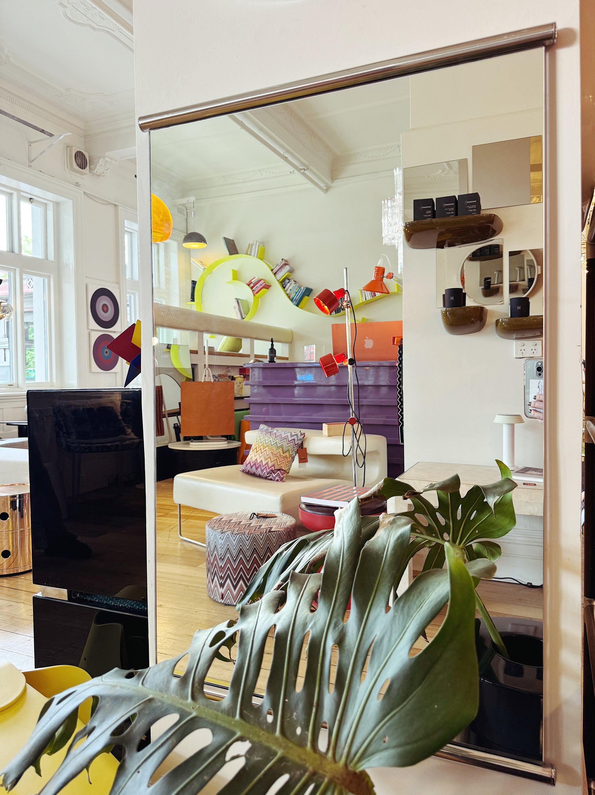 Silver chrome mirror replicating japanese scroll art with chrome bars on top and bottom. In excellent condition.