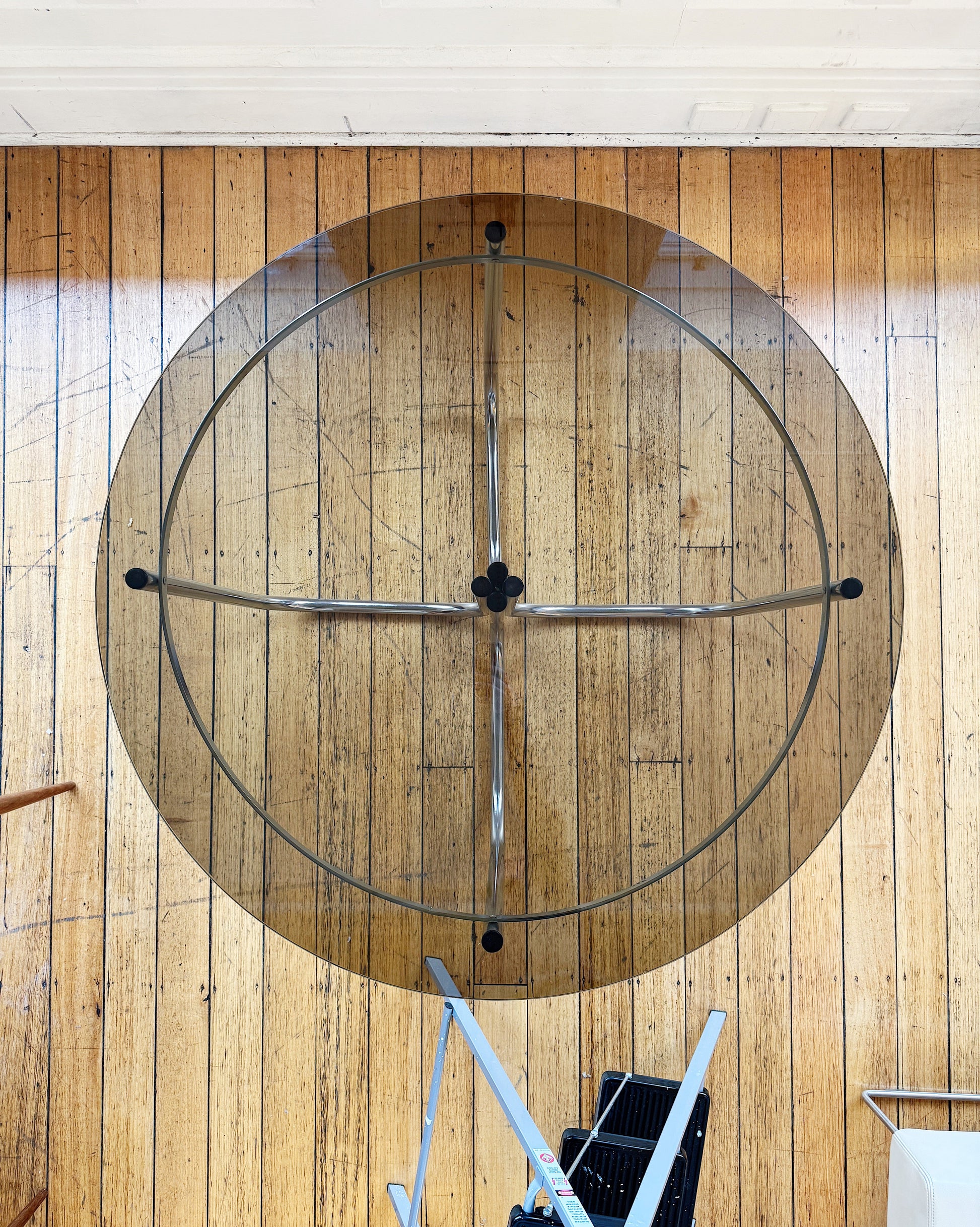 Measuring 107 cm in diameter and 72 cm in height, it’s an ideal centerpiece for a dining room or open-plan living space. Subtle signs of age — a small chip beneath the glass and light surface scratches — only underscore its authenticity and vintage character. The robust chrome frame also allows for a larger glass top, offering versatility for different settings.