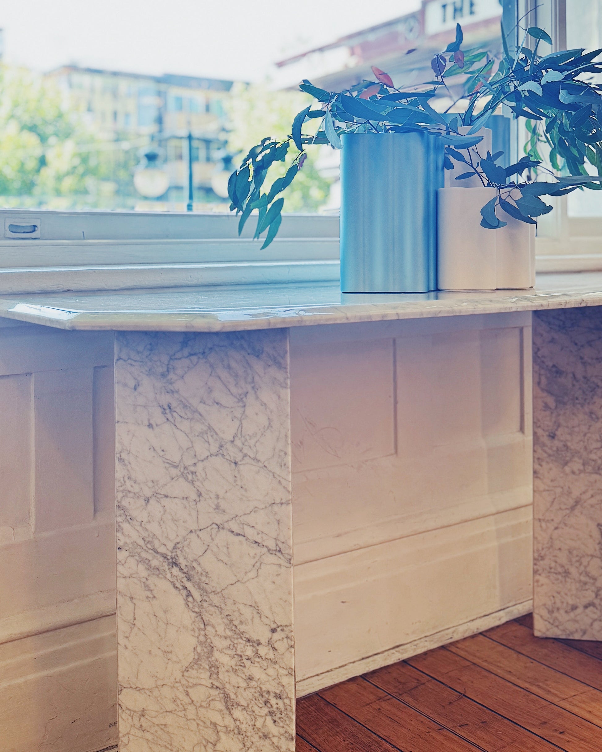 Vintage Italian Carrara marble console. Comes in three separate pieces in grey marble. The triangular shaped legs can be placed face any direction you like.