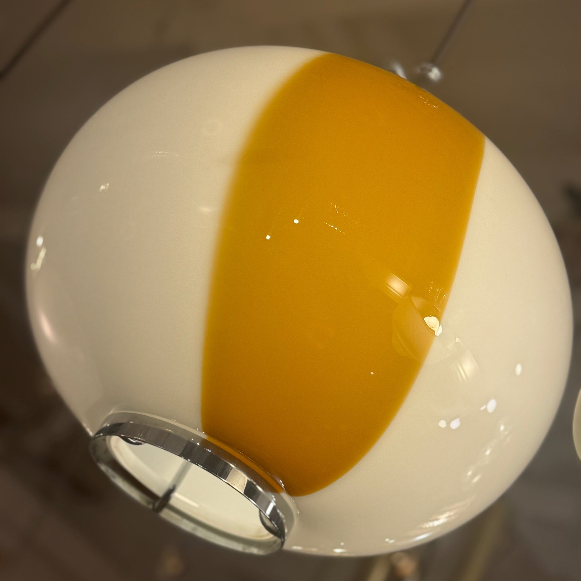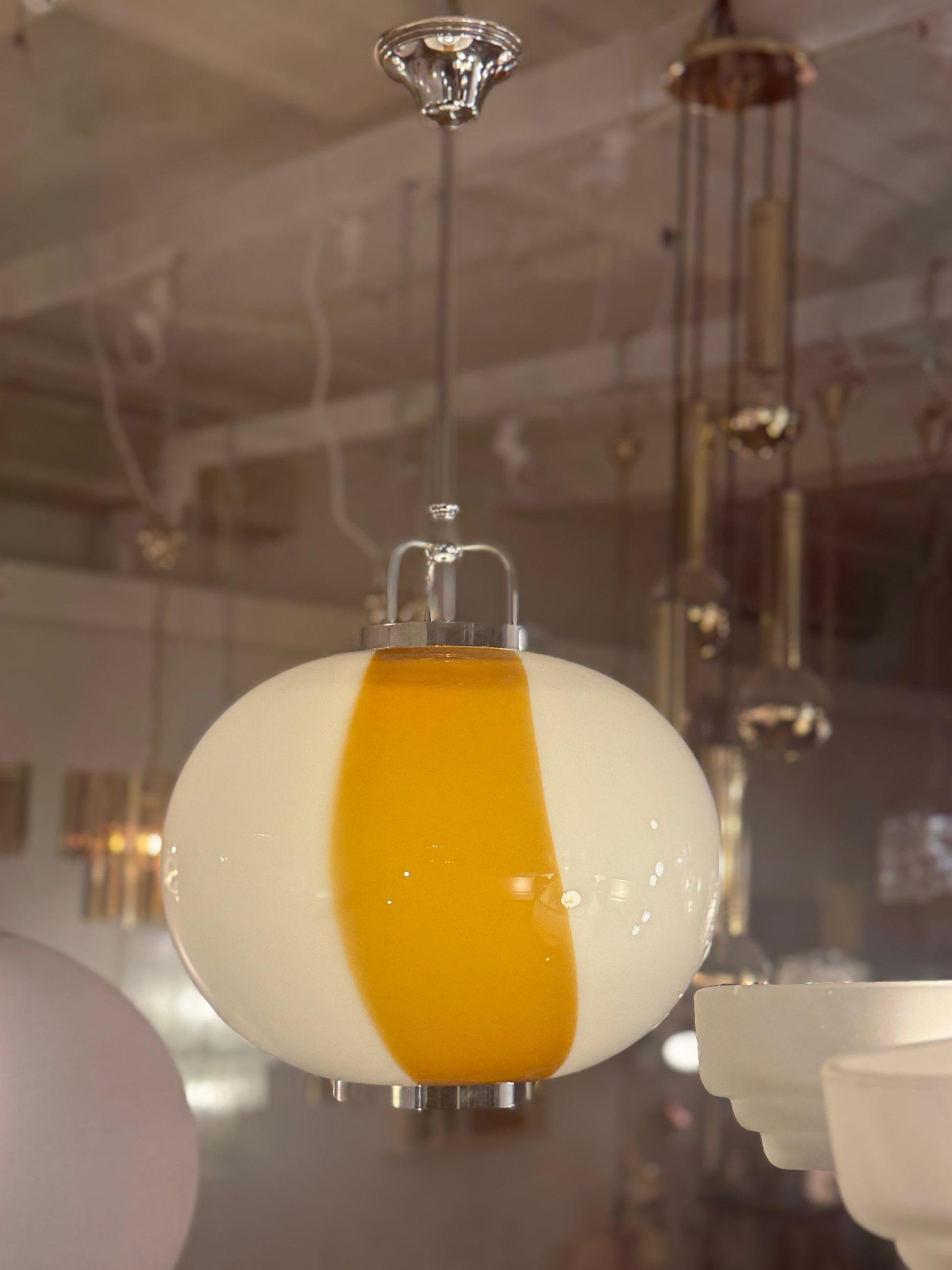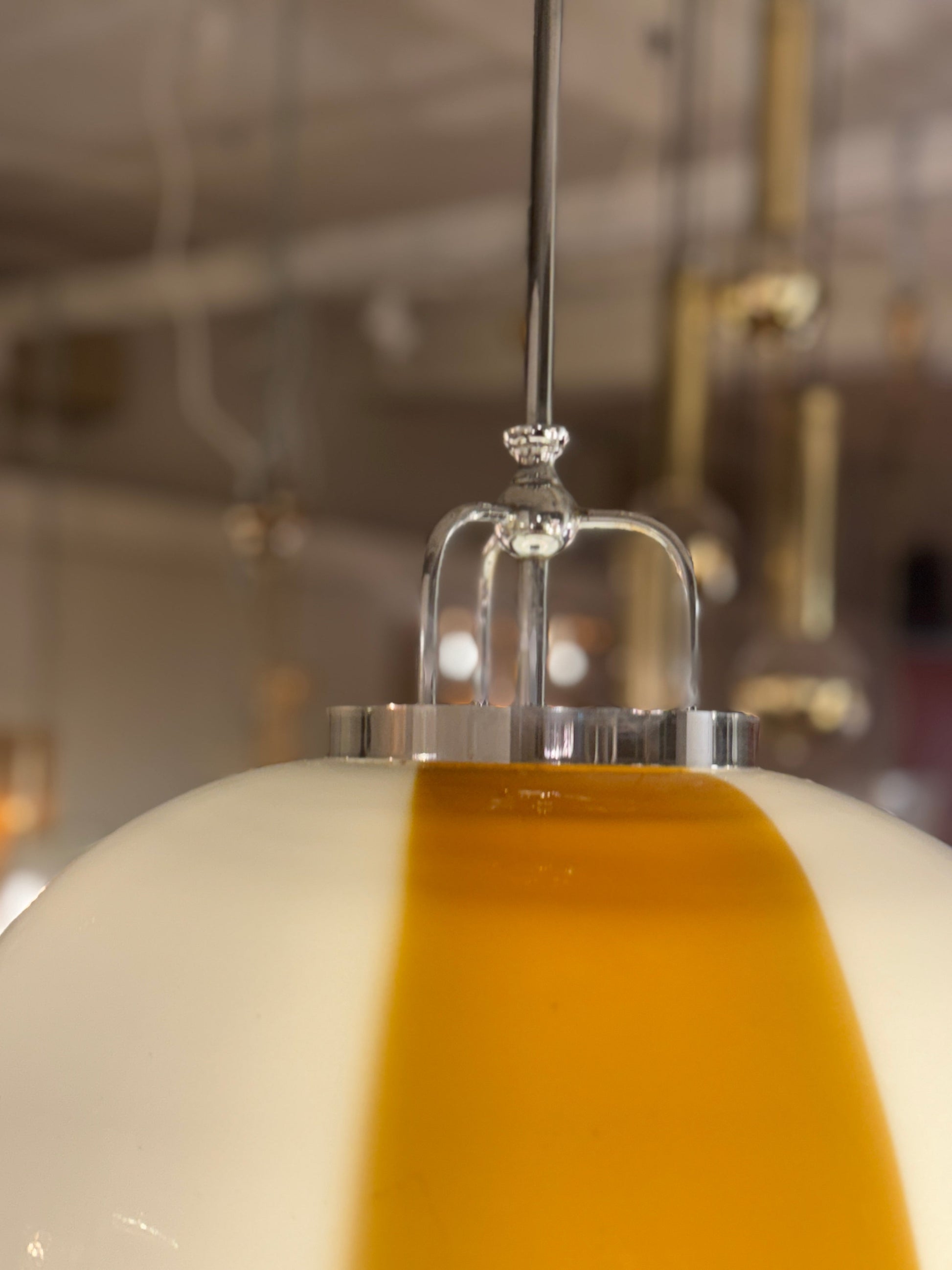 A white glass spherical pendant light with a swirl of amber on opposite sides. This Venetian glass pendant has a chrome frame and is in excellent condition.