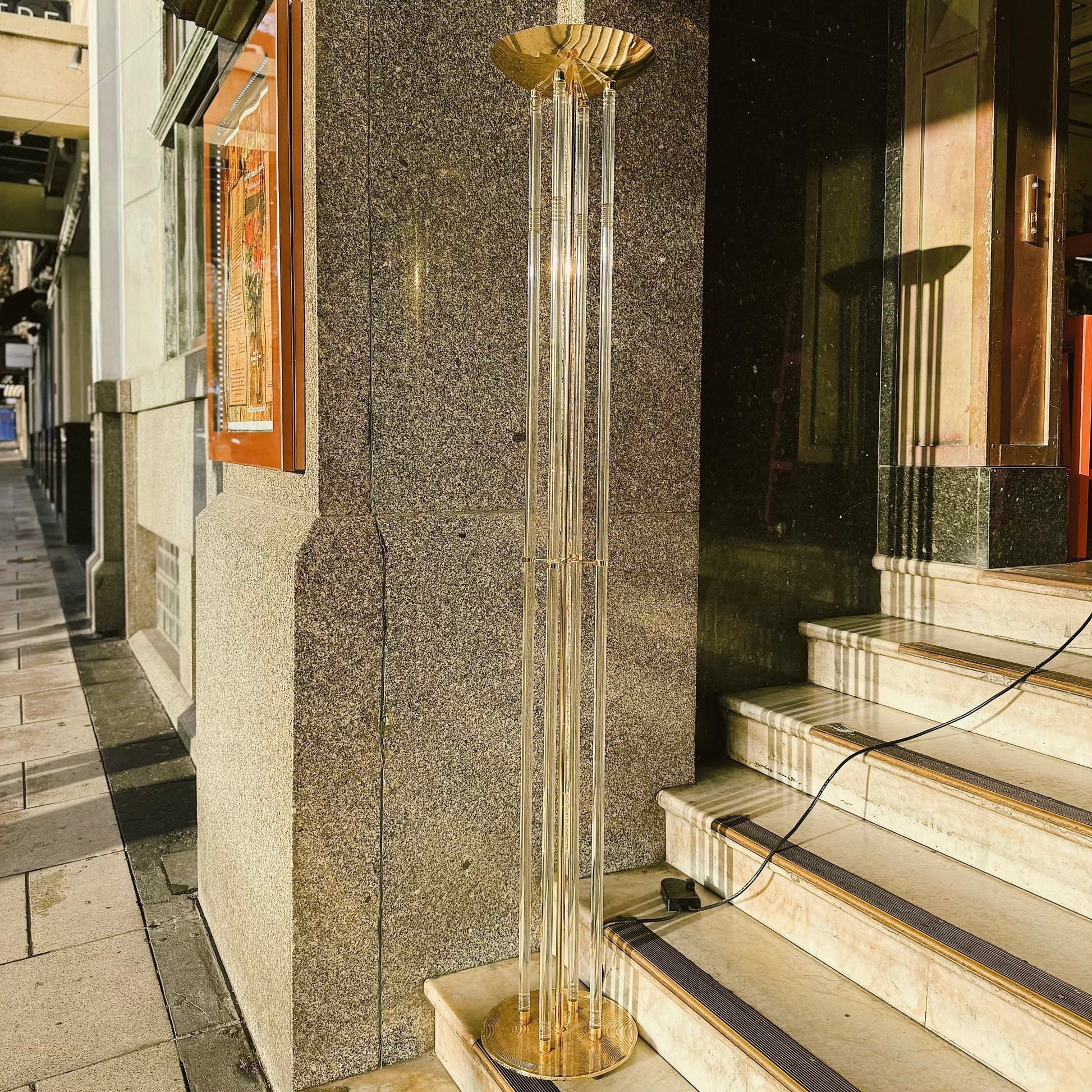 Post Modern Lucite & Brass Torchiere Floor Lamp in the manner of Lustry Kamenický Šenov. An elegant uplighter crafted from a brass base, top and central column, with four tubular lucite rods running the full length of the lamp. Looks much like the Czech Šenov but is unmarked with some patina to the brass base. Features a dimmable switch and halogen globe.