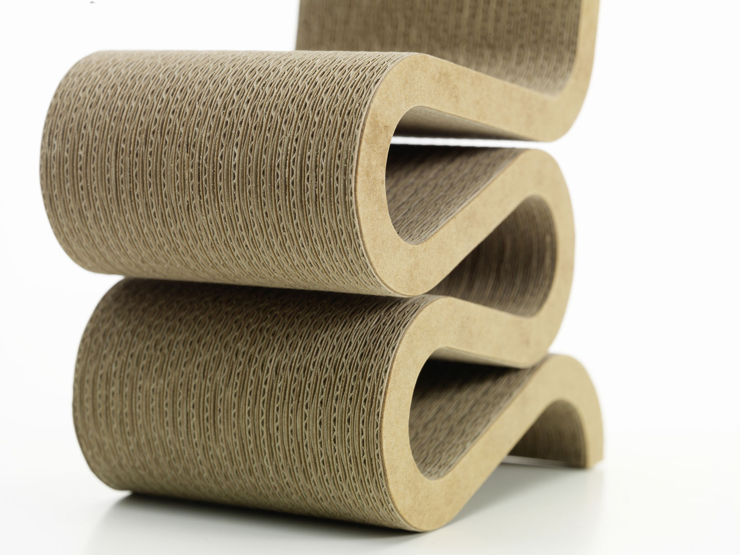 Frank O. Gehry discovered a process which enabled cardboard furniture to be made in massive blocks – cardboard sculptures, as it were. »One day I saw a stack of corrugated cardboard in my office; it was the material I used to build my architectural models. And I started playing around with it, gluing it together and then cutting it into shape with a handsaw and a pocket-knife«. Gehry called the material made of corrugated cardboard glued in layers that ran at right angles to each other »Edge Board«. In 1972 he brought out a series of extraordinarily stable cardboard furniture called »Easy Edges«.